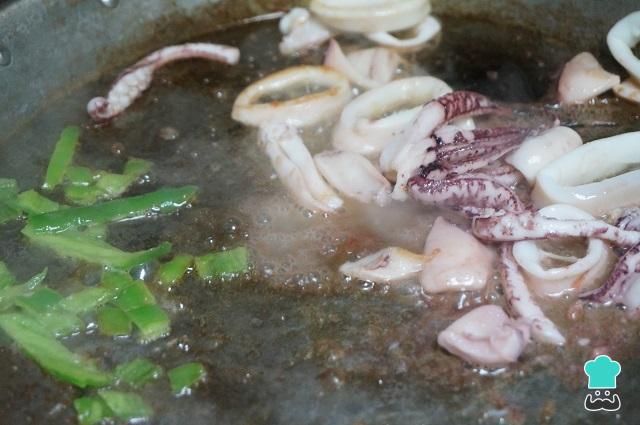 Dejamos cocinar la sepia y añadimos el pimiento verde troceado para que se vaya cocinando el sofrito de la paella marinera fácil.