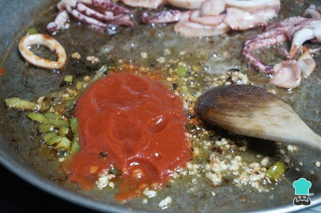 Cuando el pimiento empiece a coger color añadimos el ajo picado, removemos y antes de que coja mucho color añadimos el tomate. Removemos, dejamos cocinar unos minutos para que se haga el sofrito de la paella marinera casera.