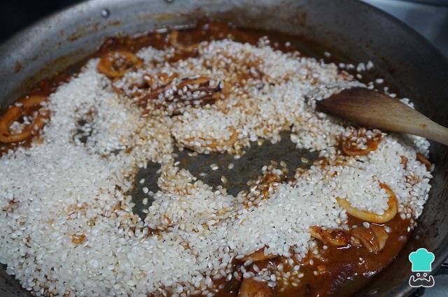 Cuando veamos que el sofrito esta listo, echamos el arroz a la paella marinera y removemos.