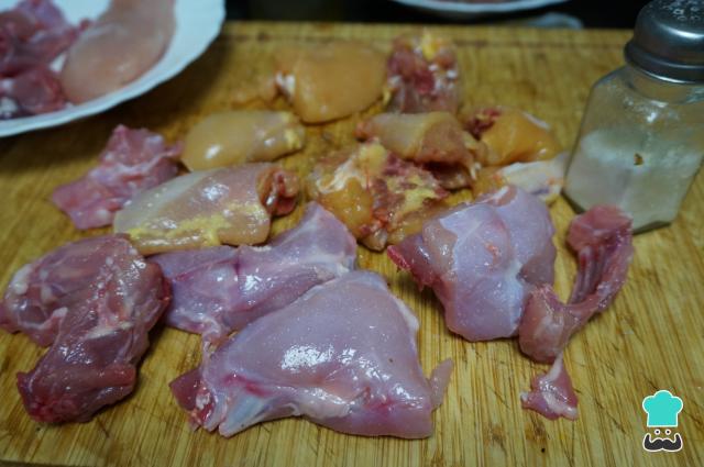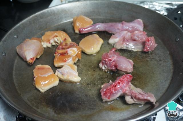 Limpia y corta el pollo y el conejo en trozos. Luego, sala las piezas al gusto. Por otro lado, cabe destacar que si usas garrofón tierno, podrás añadirlo directamente en el paso correspondiente, pero si es garrofón seco, deberás dejarlo en remojo la noche anterior y cocerlo antes de hacer la paella para que quede tierno.