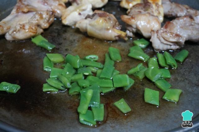 Lava las judías verdes, corta las puntas y trocéalas. Cuando esté la carne dorada,déjala en un lado de la paella y añade las judías verdes. Deja que se cocinen unos minutos, los suficientes para que se doren un poco. En algunas zonas se considera que la paella valenciana original debe llevar caracoles. Sin embargo, al no ser así en todos los lugares, te dejamos decidir si quieres o no añadirlos. En caso afirmativo, deberás agregarlos con las judías, previamente lavados.