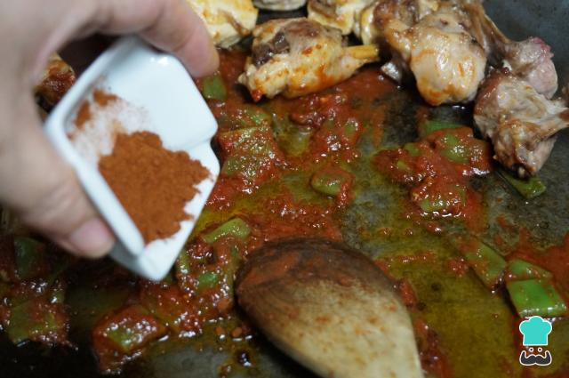 Si ves que no hay mucho aceite, ve añadiendo. Agrega el tomate natural picado o triturado y remueve, deja que se cocine durante 5 minutos a fuego medio. Incorpora el pimentón dulce y remueve bien. Lo ideal es hacer la paella valenciana con tomate natural, pero si no tienes, puedes usar tomate triturado de bote (preferiblemente natural y no frito).