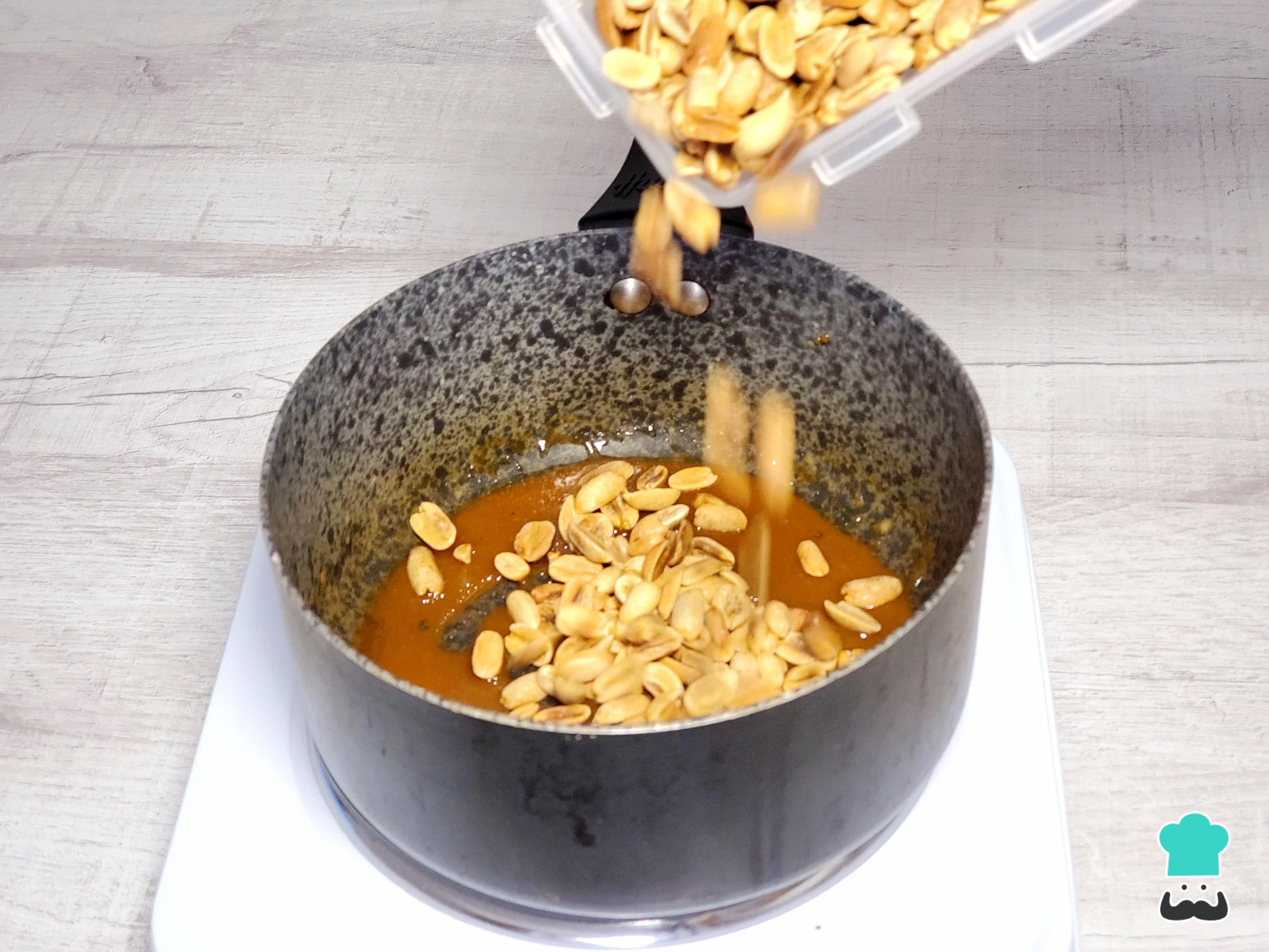 Reduce el fuego y agrega el cacahuate previamente tostado.