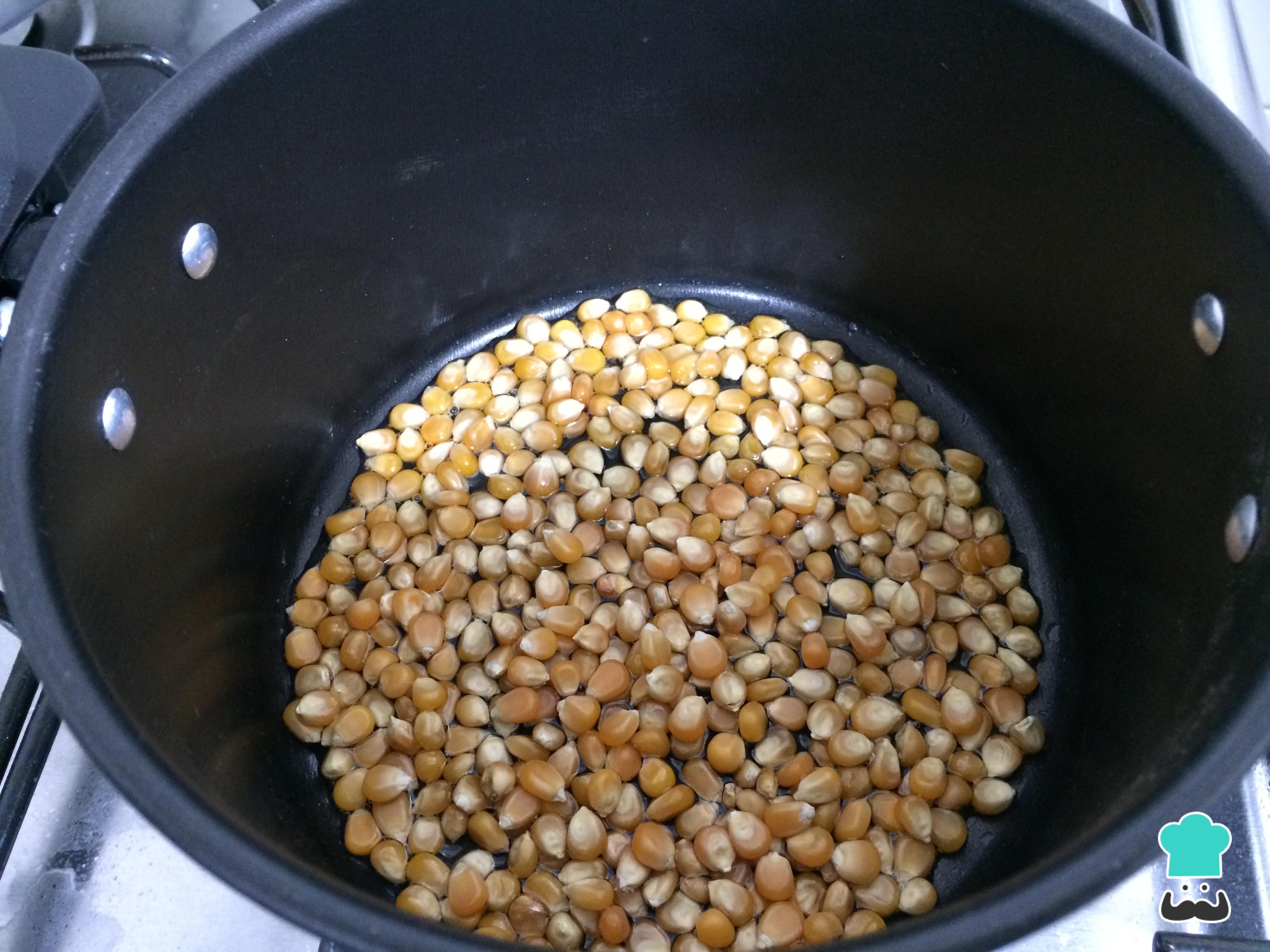 En una olla, añadir el aceite y el maíz, cocinar a fuego bajo tapado, hasta que todo el maíz reviente.