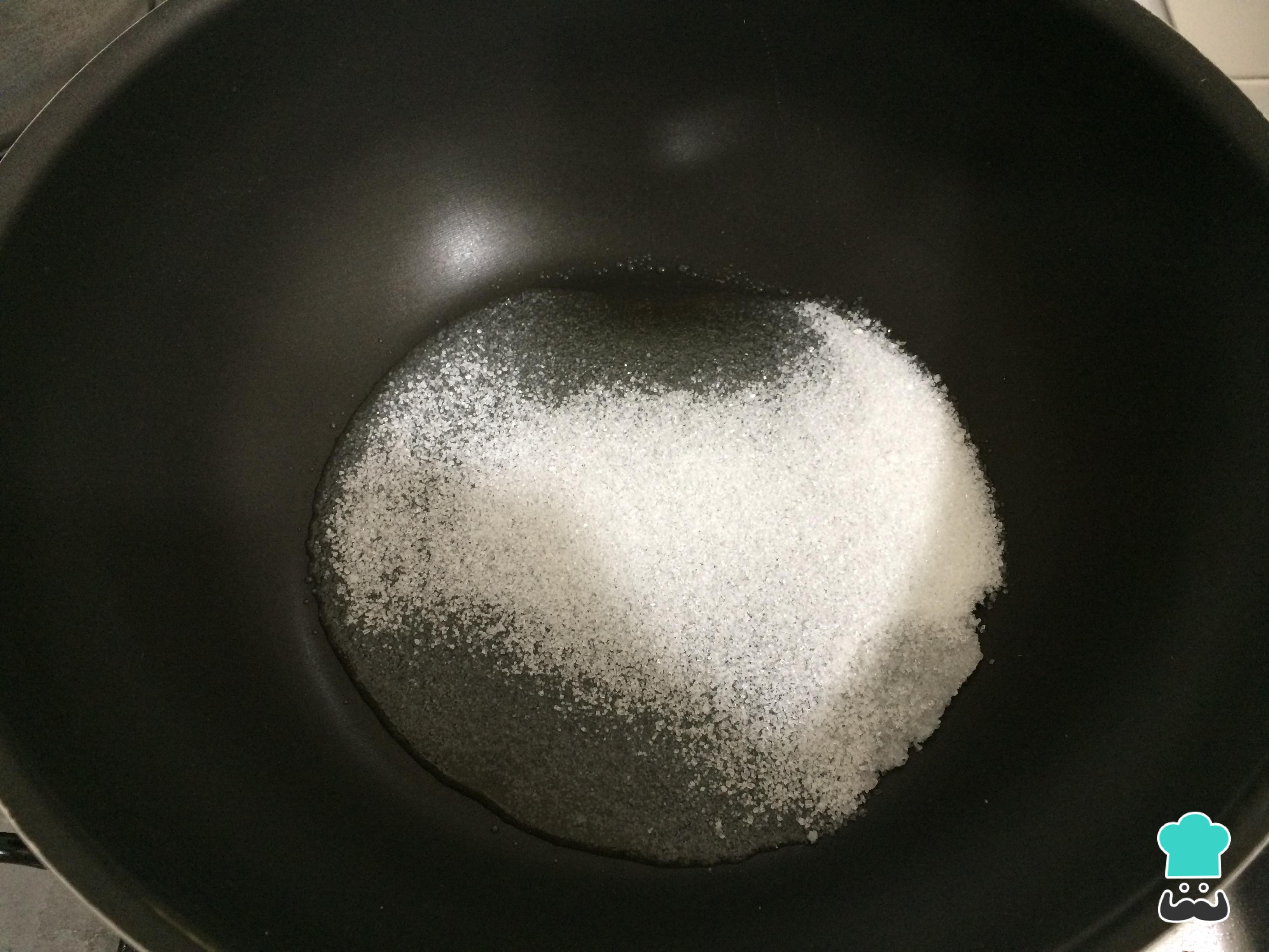 Aparte, en otra olla grande, disponer el azúcar y cocinar a fuego muy bajo sin mezclar, esto con el fin de obtener un caramelo. SI quieres más detalles consulta la receta de caramelo líquido.