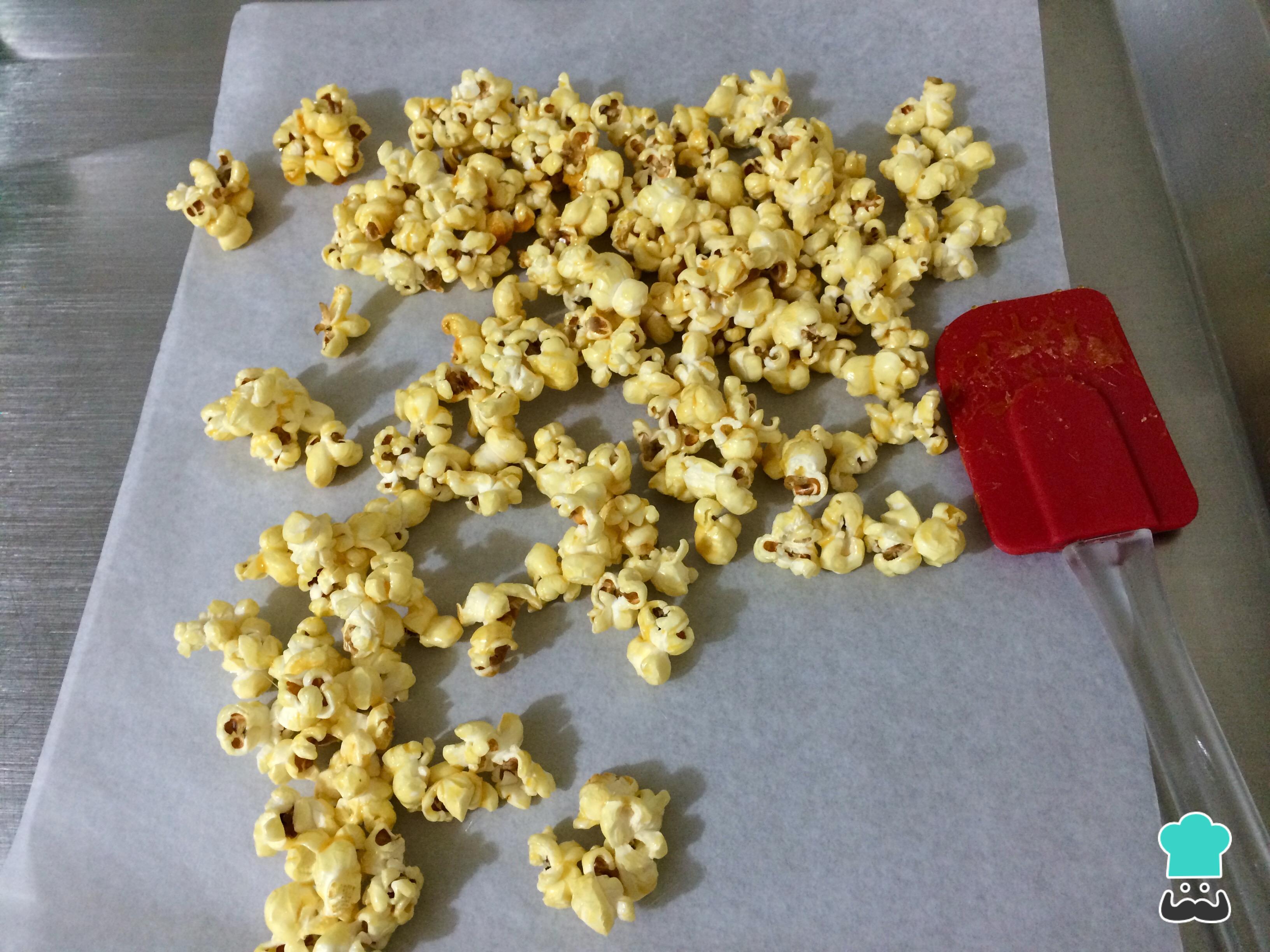 Extiende una hoja de papel parafinado o papel para hornear sobre una superficie plana y esparce sobre él las palomitas de maíz caramelizadas. Deja reposar durante unos minutos para que se enfríe el caramelo, no las comas de inmediato porque el caramelo puede quemar fácilmente.
