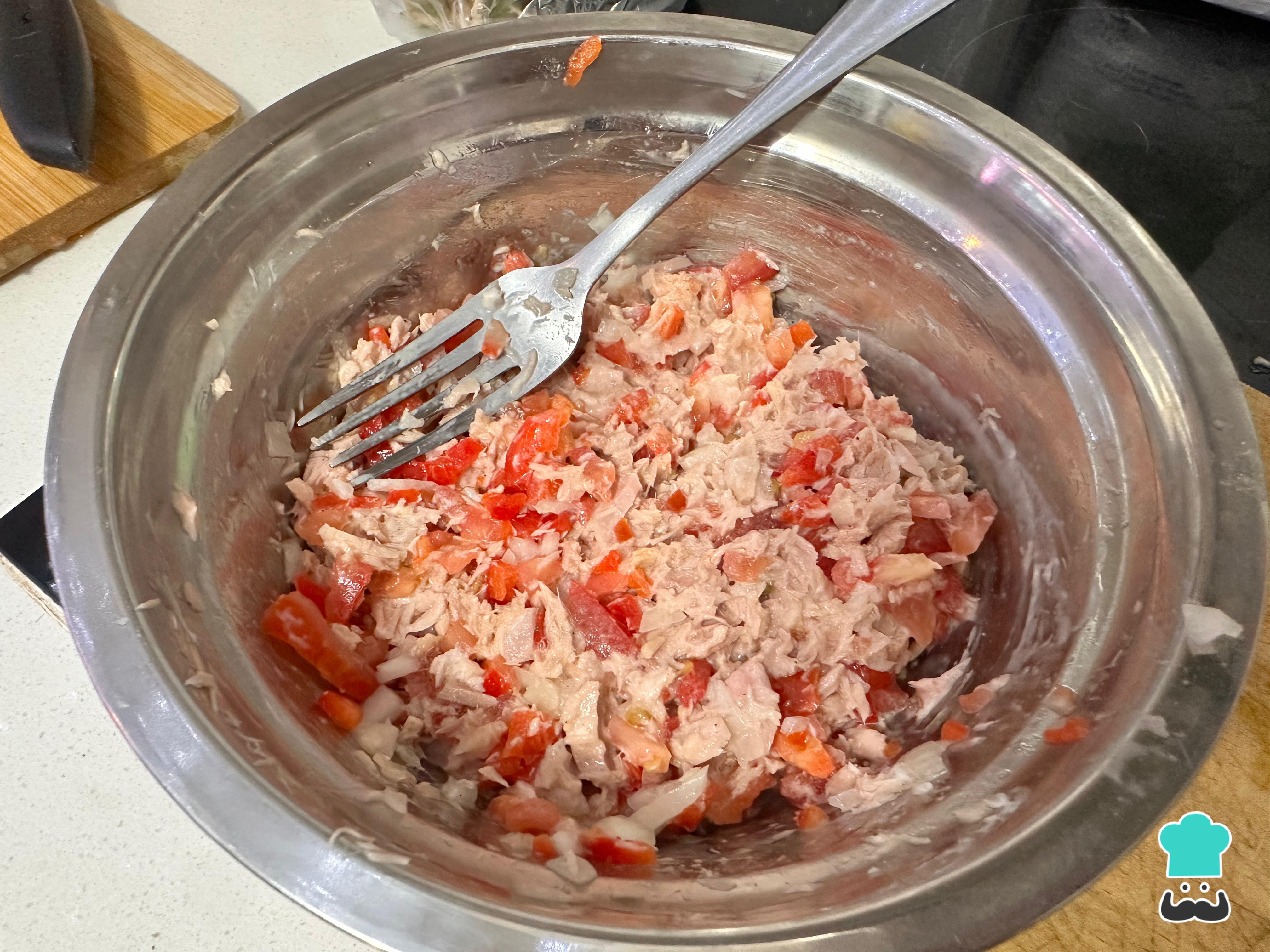 En un bol, coloca el atún previamente escurrido para retirar el exceso de líquido. Desmenúzalo ligeramente con un tenedor para facilitar la mezcla con el resto de los ingredientes.