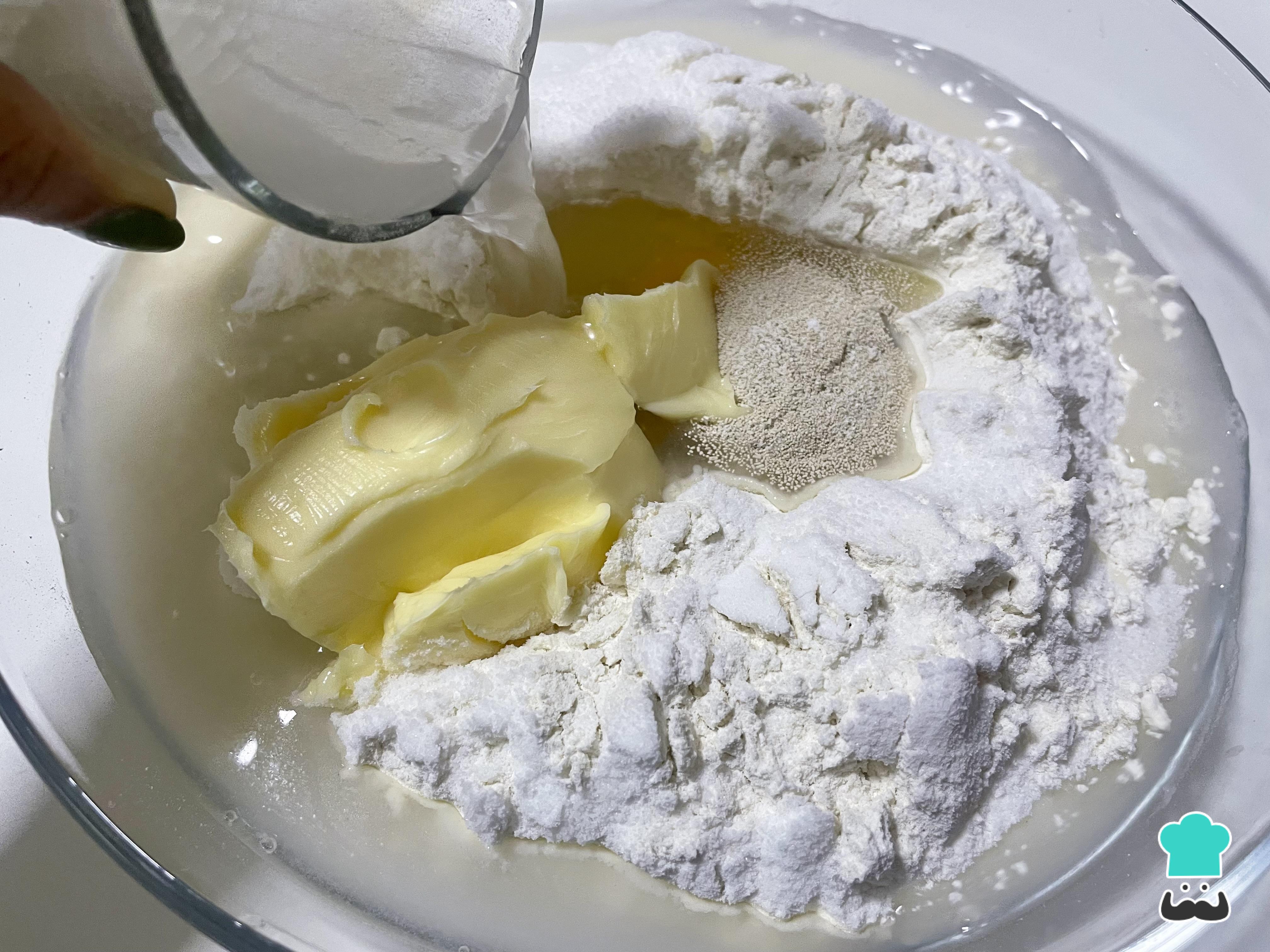 Coloca en un bowl la harina, la levadura seca, el azúcar, 1 huevo y la margarina. Luego, agrega el agua y mezcla durante 3 minutos hasta que todos los ingredientes estén integrados.