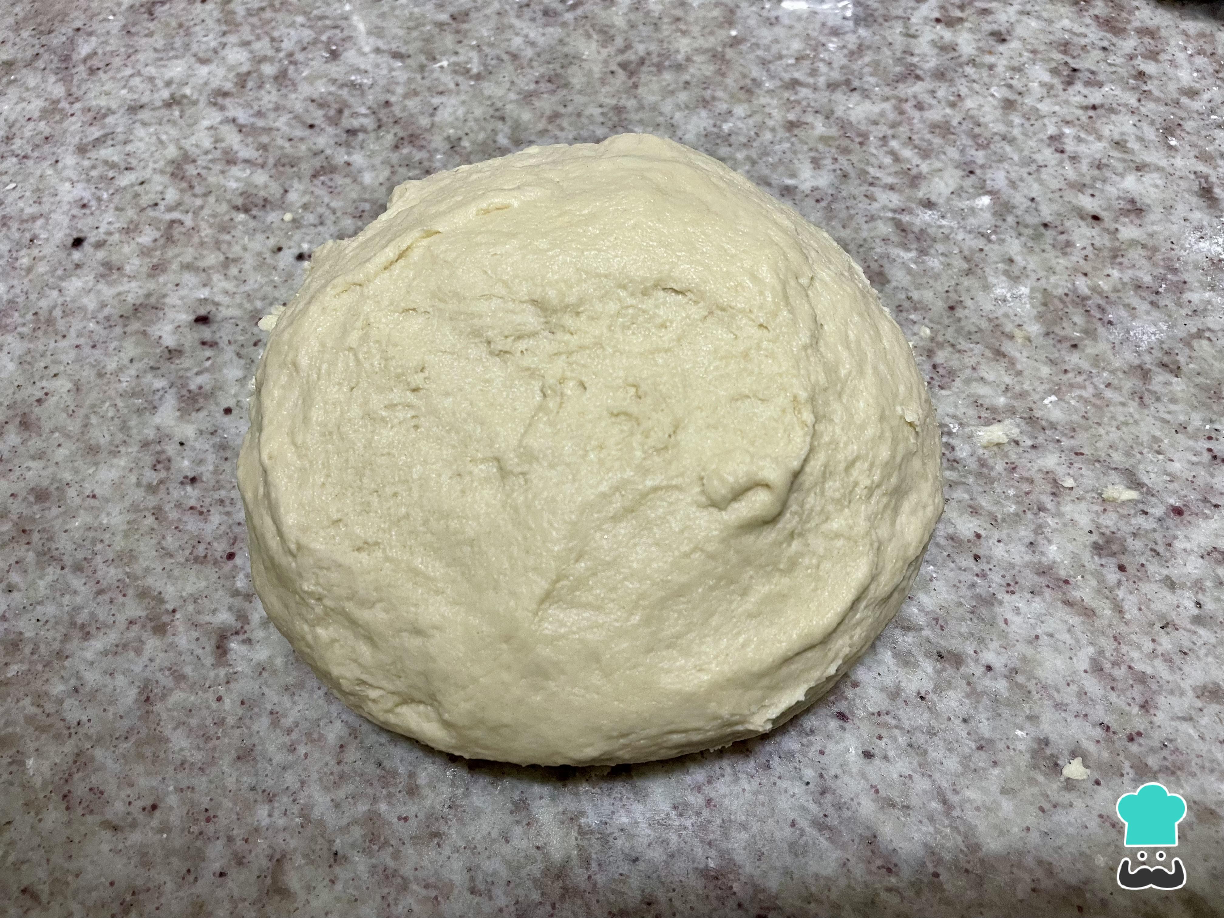 Pasa la masa al mesón o superficie de trabajo y amasa durante 5 minutos. Si la masa está muy pegajosa agrega un poco más de harina. Déjala reposar tapada durante 10 minutos.