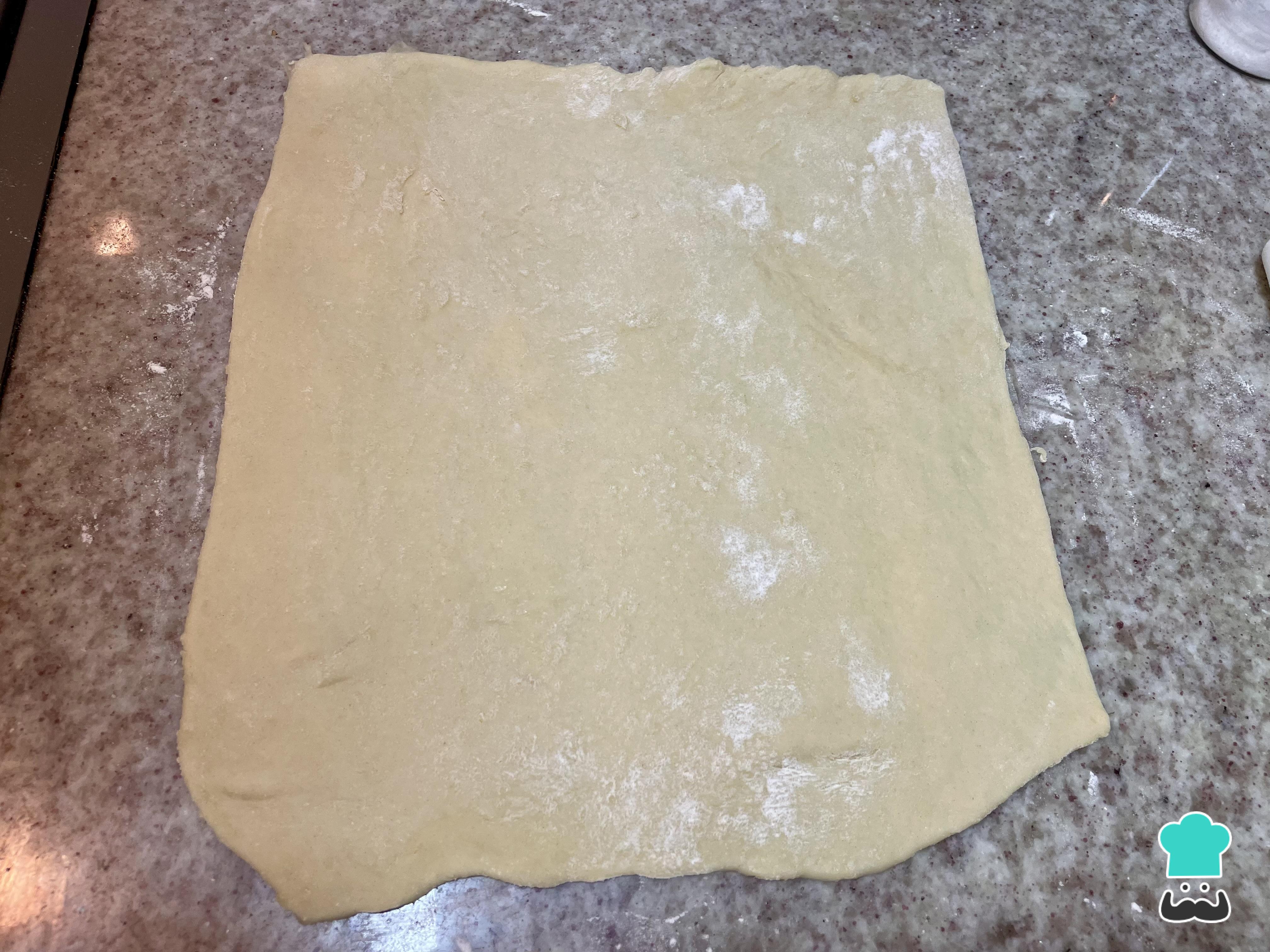 Estira la masa en forma de rectángulo y corta los bordes para que quede uniforme.