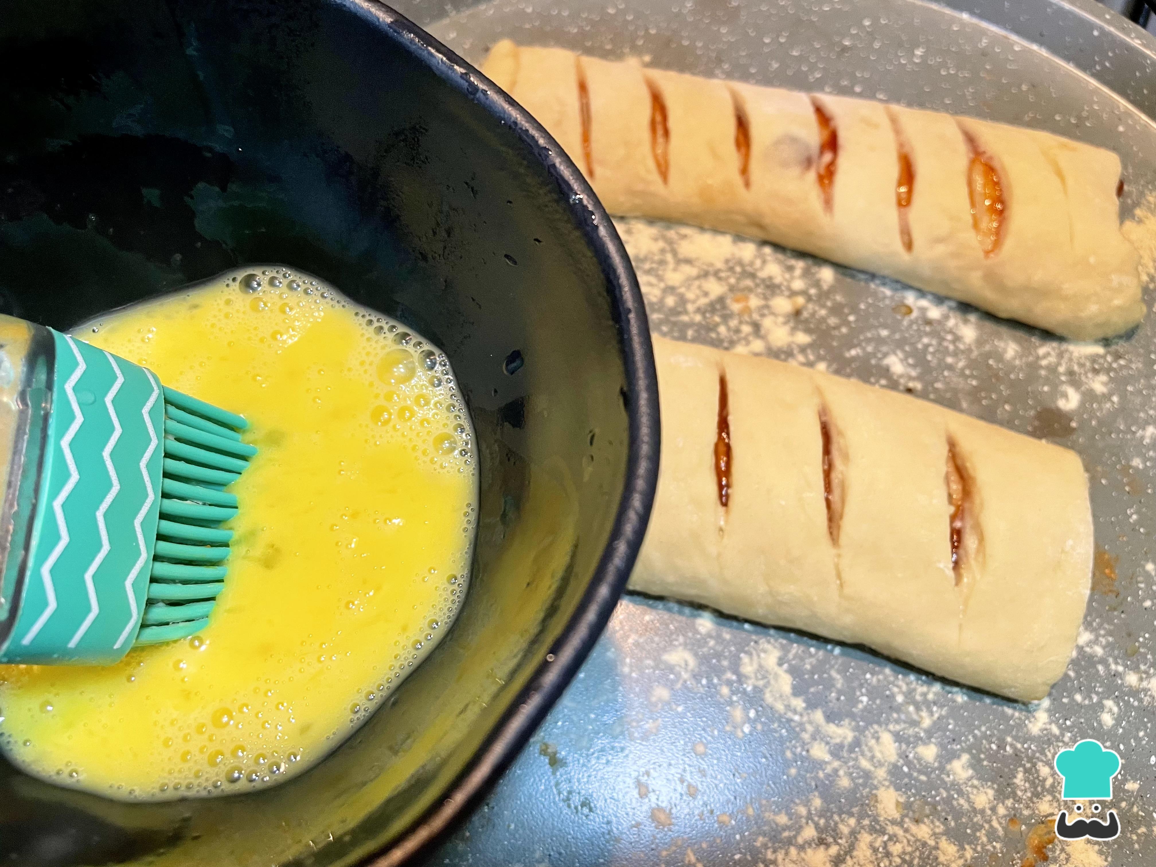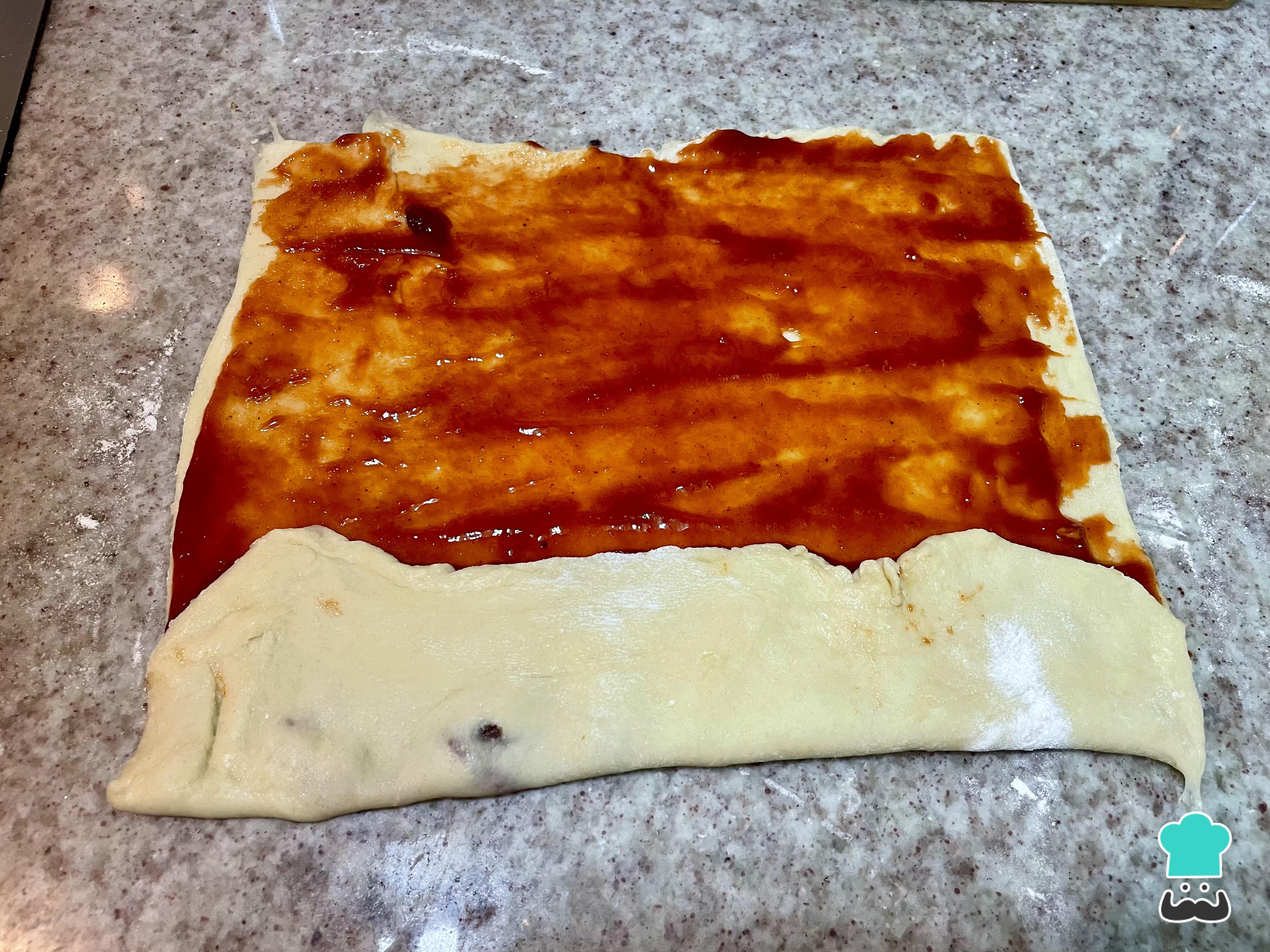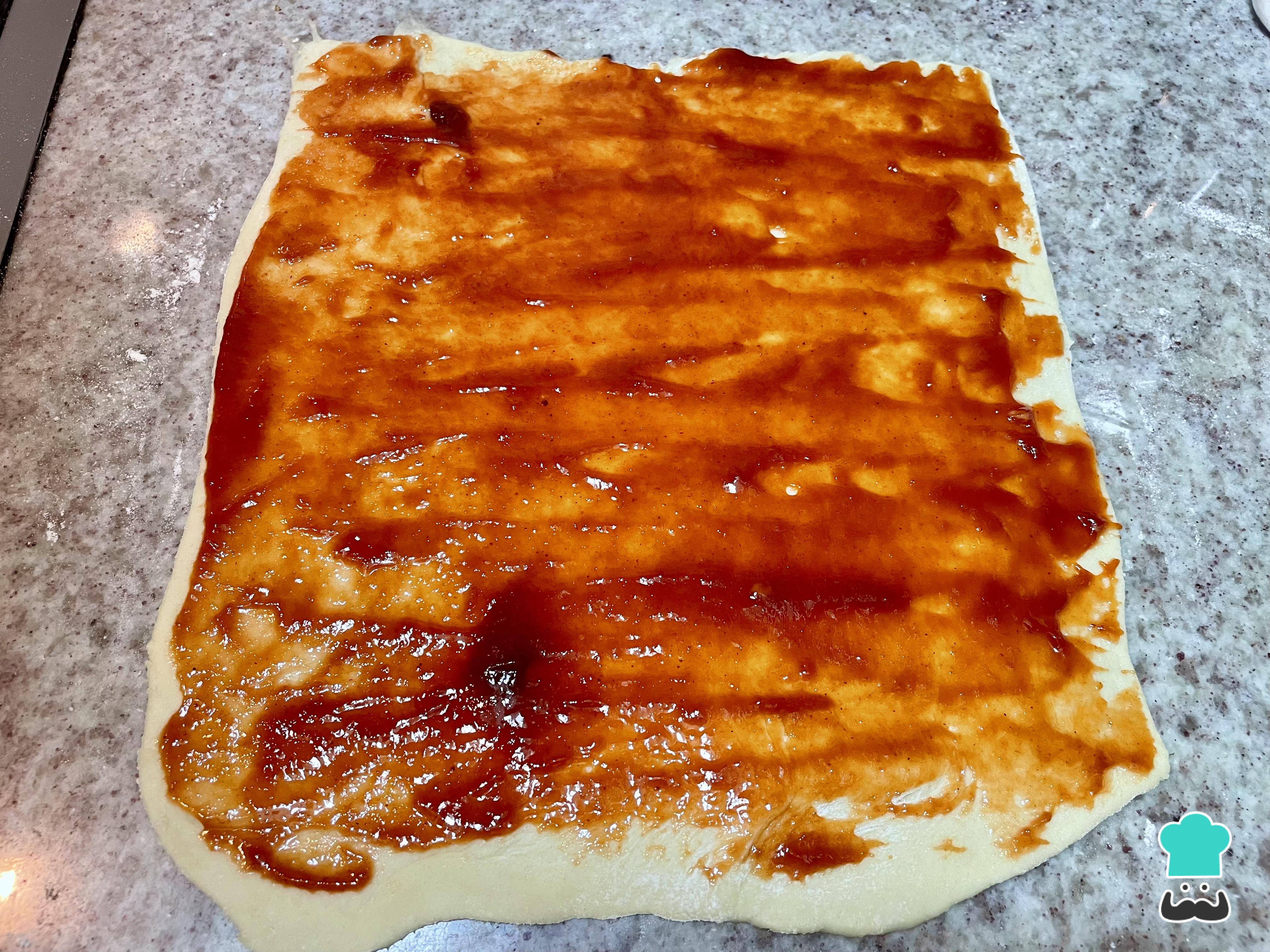 Unta una capa de mermelada de guayaba sobre la superficie de la masa. No uses demasiada cantidad para evitar que se desborde.