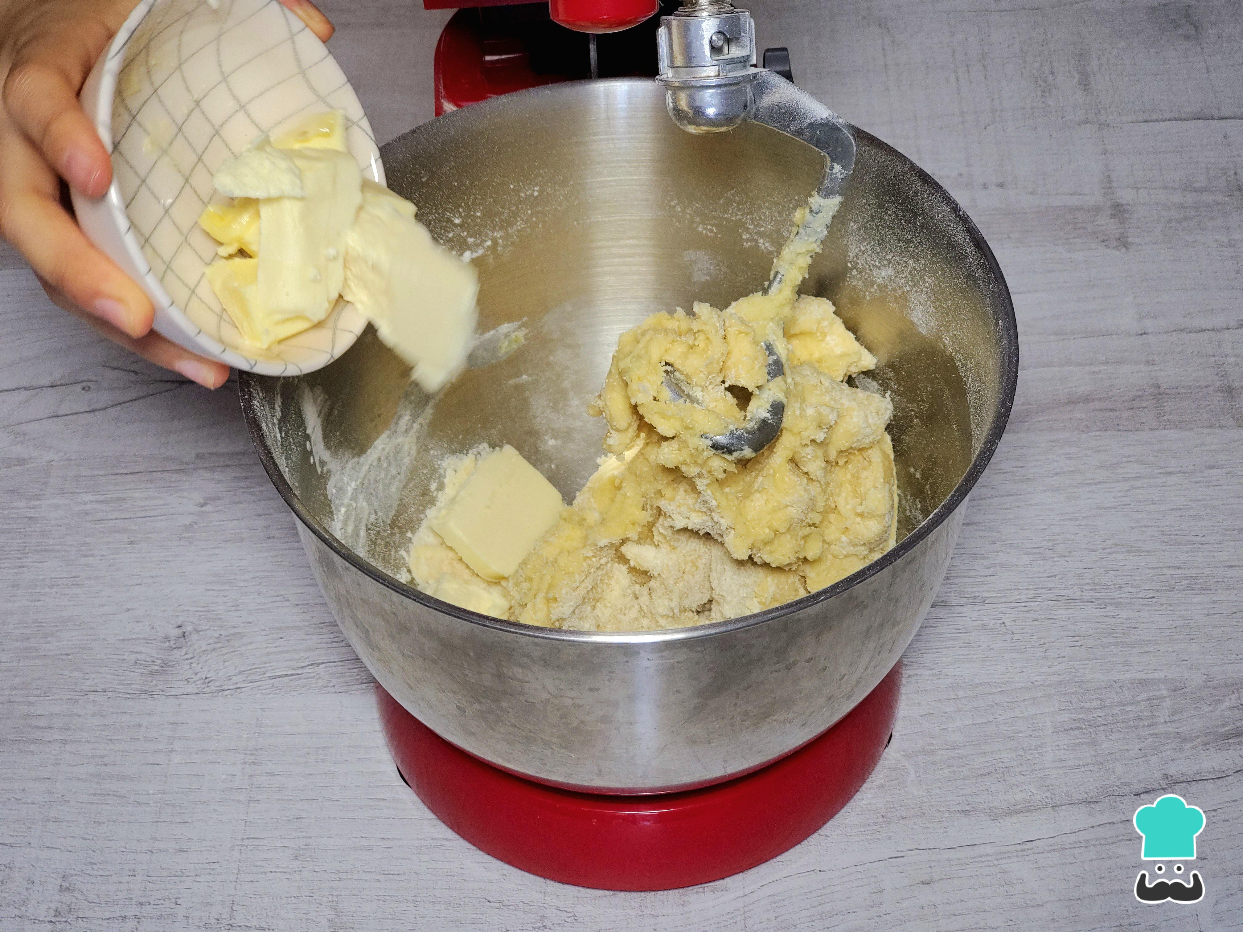 Enciende la batidora a velocidad media y comienza a mezclar. Cuando veas que se está formando una masa, incorpora la mantequilla fría, previamente cortada en cubos, poco a poco.