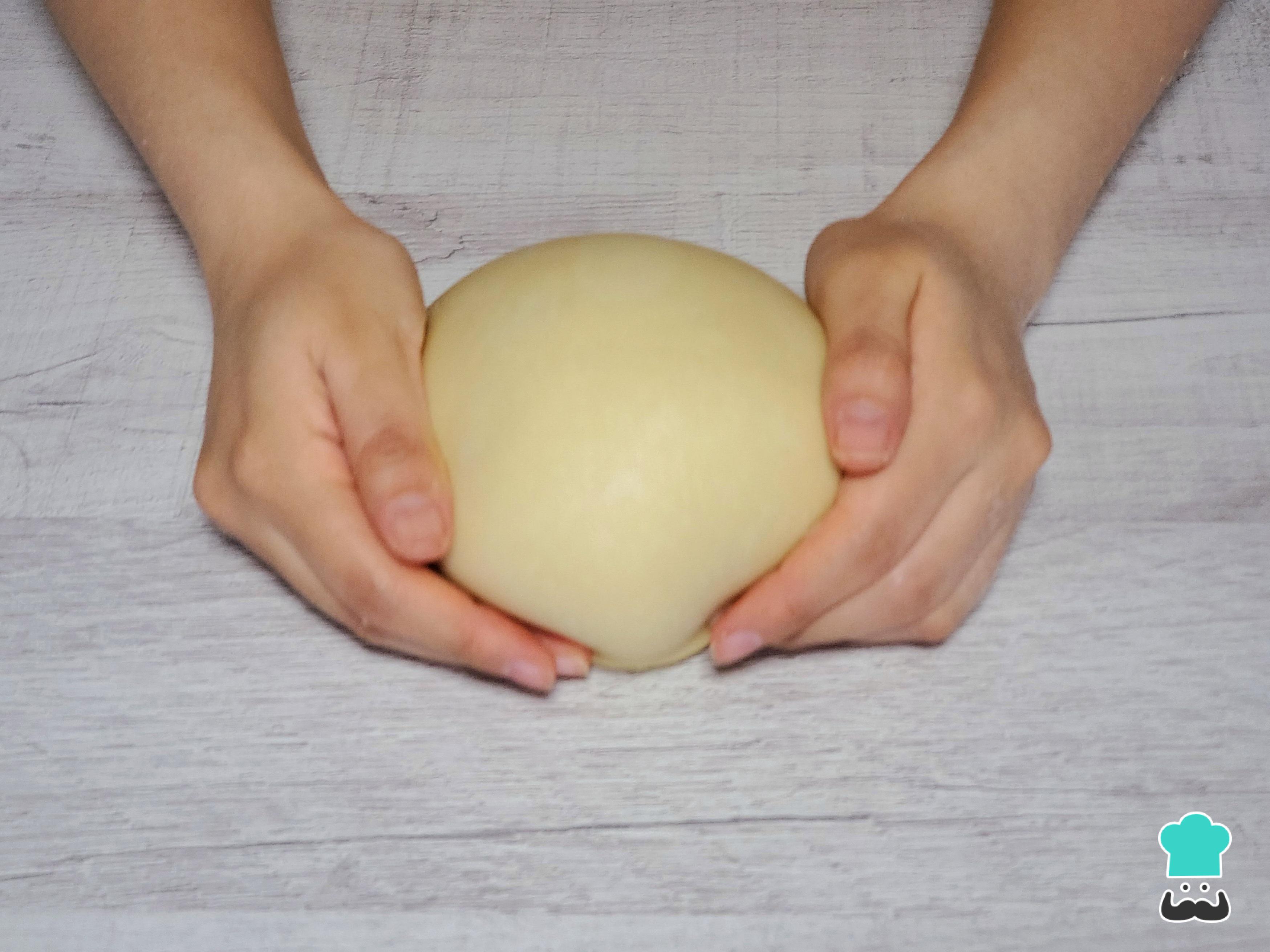 Bolea la masa principal nuevamente, jalándola hacia el cuerpo repetidas veces hasta formar una bola con superficie prolija. Luego, levántala y pincha bien la unión en la base para evitar que se abra durante el horneado.