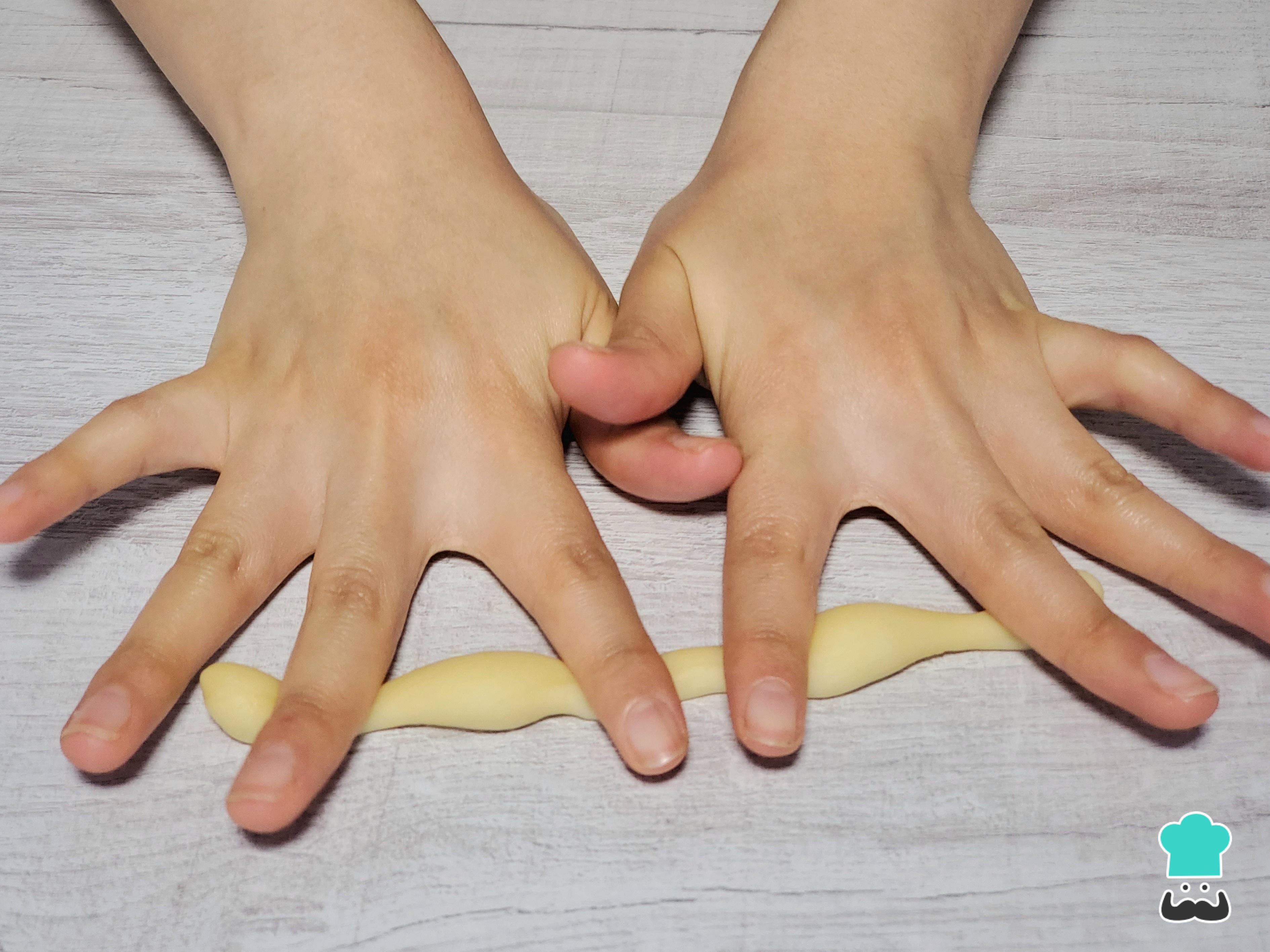 Para hacer las decoraciones, estira las tiras de masa hasta que tengan el diámetro suficiente para cubrir la superficie del pan. Colócalas sobre la mesa y, con los dedos, hunde tres puntos en cada tira para lograr el efecto característico de estos panes. No olvides bolear la pequeña bolita que irá en la parte superior.