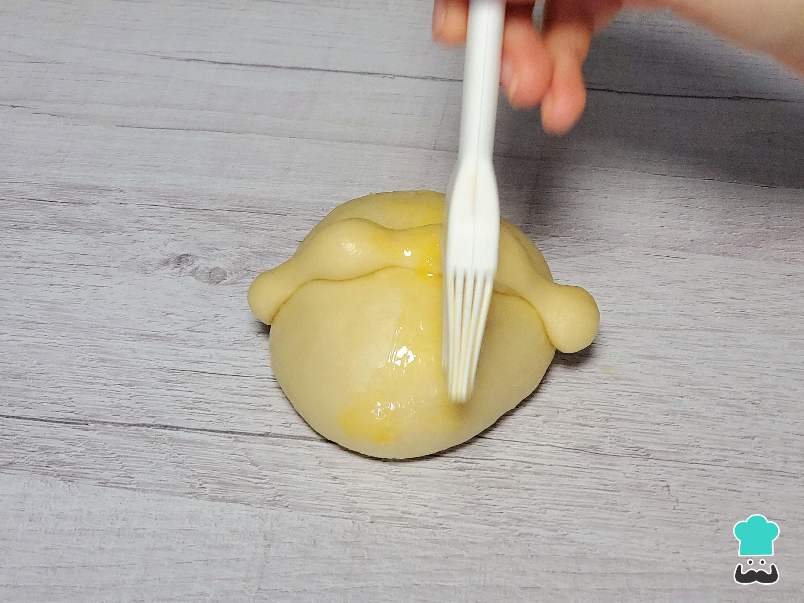 Decora el pan con las tiras. Para asegurarte de que queden bien adheridas, puedes usar un poco de huevo batido. Coloca las tiras en forma entrecruzada y simétrica. Luego, con el dedo índice, presiona el centro donde se unen las tiras y pega allí la bolita reservada, también con huevo batido.