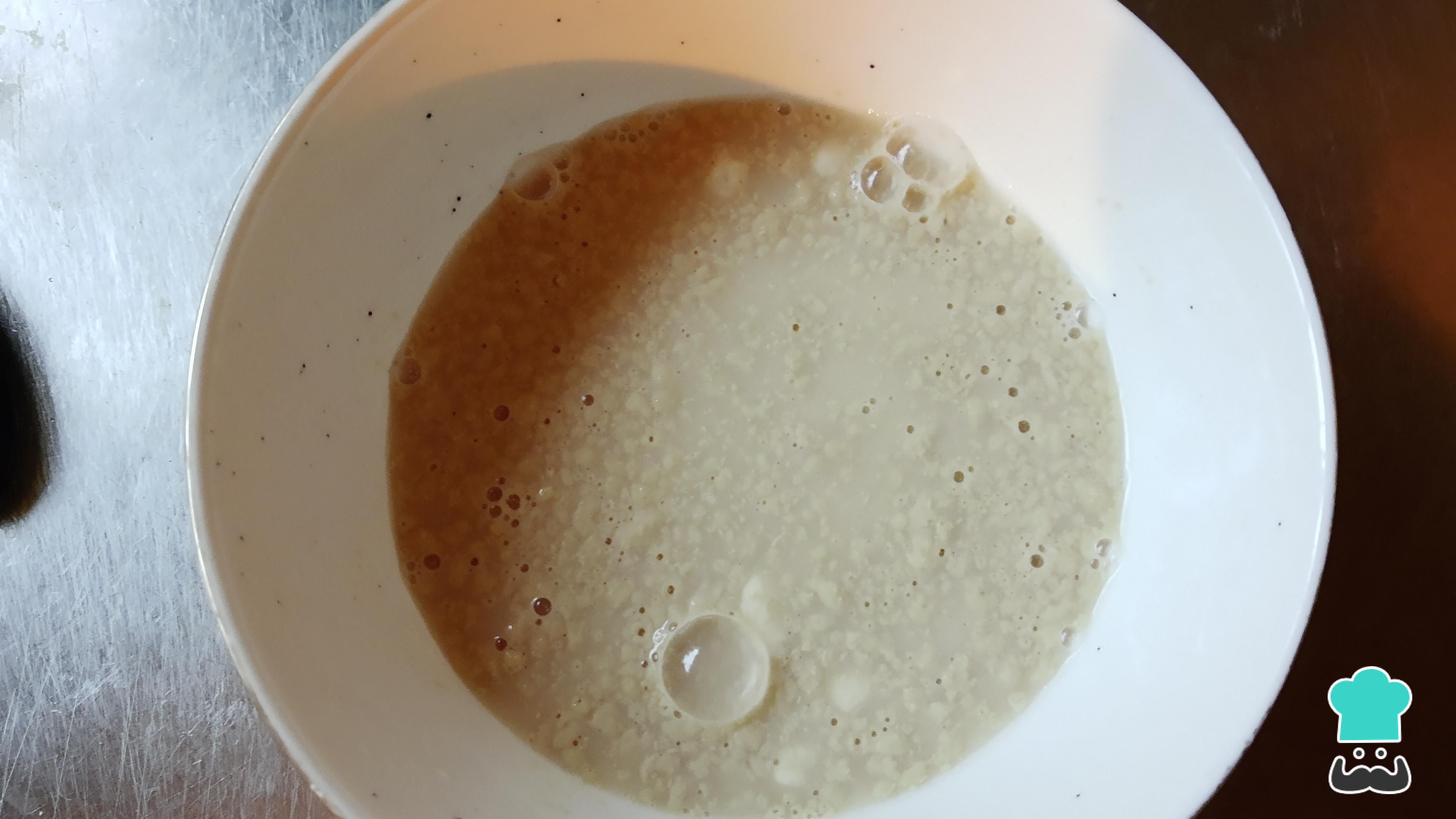 Para hacer la receta de pan de muerto relleno de queso Philadelphia, primero en un recipiente con 90 mililitros de agua tibia, disuelve la levadura seca con una cucharada de azúcar y una cucharada de harina. Mezcla hasta que se integre todo y deja reposar en un espacio cálido durante unos 15 minutos para que fermente.