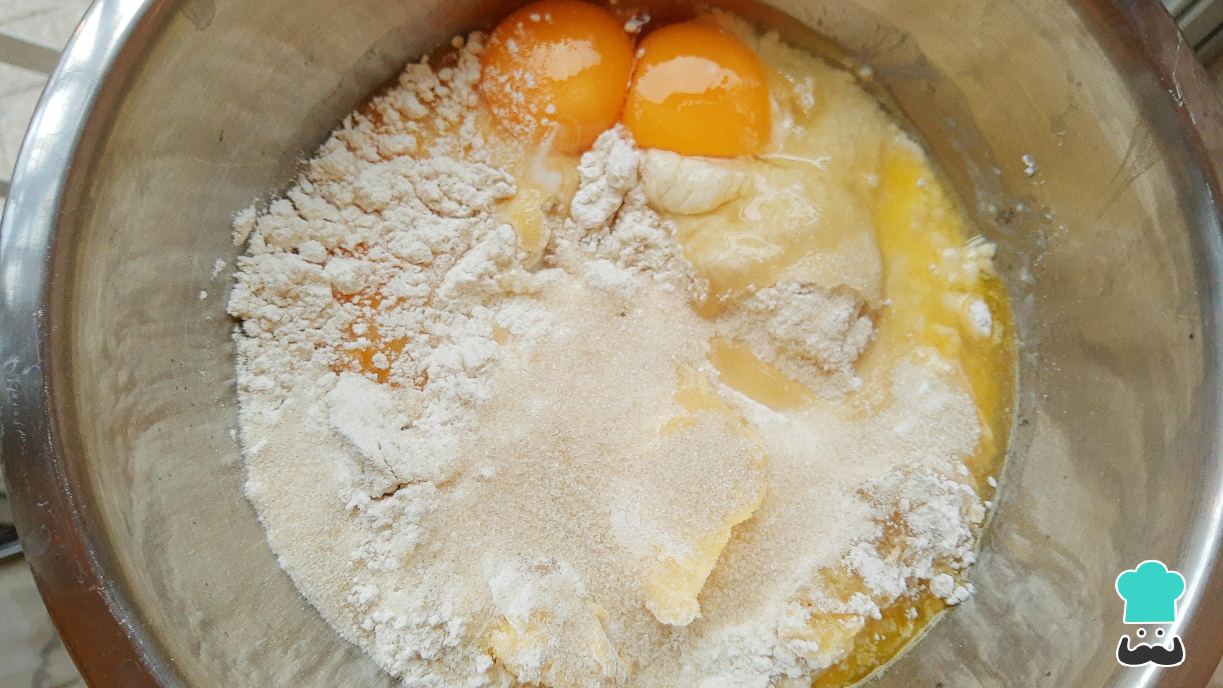 Mientras reposa la levadura, en un bol grande mezcla la harina de trigo, el azúcar, la pizca de sal, los huevos y la mantequilla, puedes usar también manteca vegetal o aceite de coco.