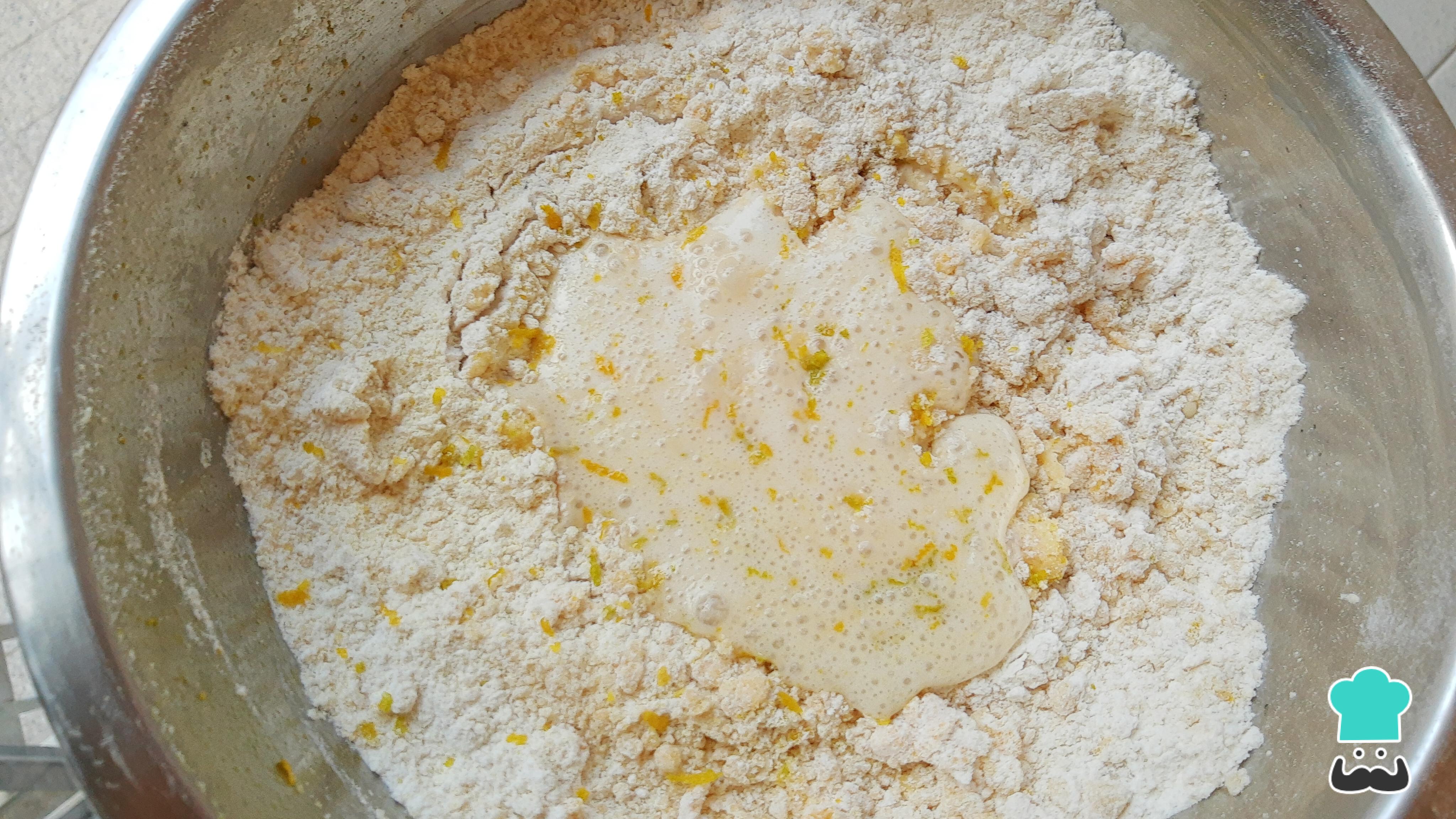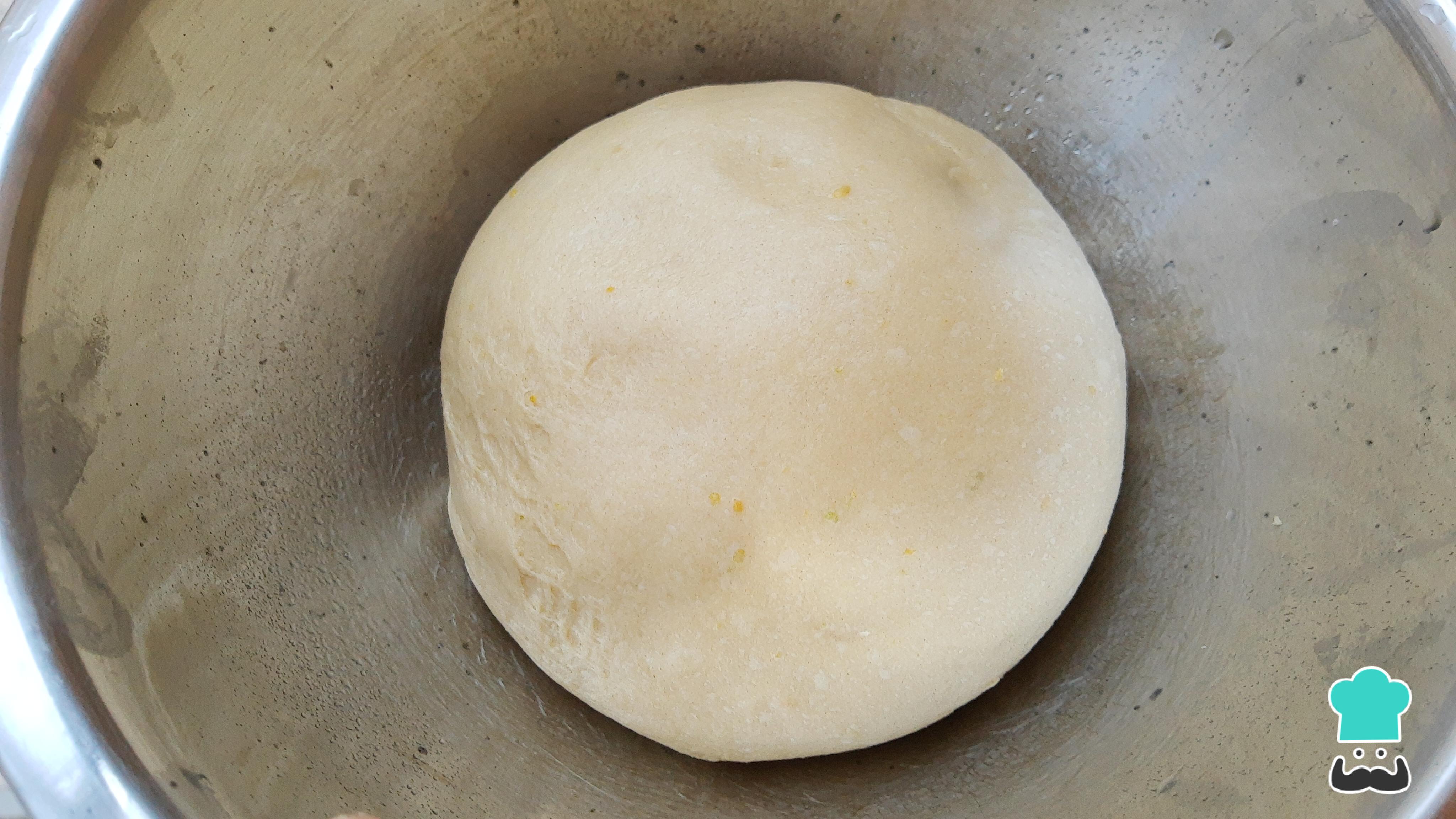 Cuando la levadura haya fermentado, añade al bol con la harina, también agrega la ralladura de naranja y la esencia de azahar, mezcla hasta que comience a formarse una masa. Debes saber que esta se pondrá pegajosa y es probable que sea muy difícil de manejar, pero el secreto de un buen pan es el amasado, puedes hacerlo manualmente durante unos 30 a 40 minutos. Incluso puedes utilizar una batidora con gancho.