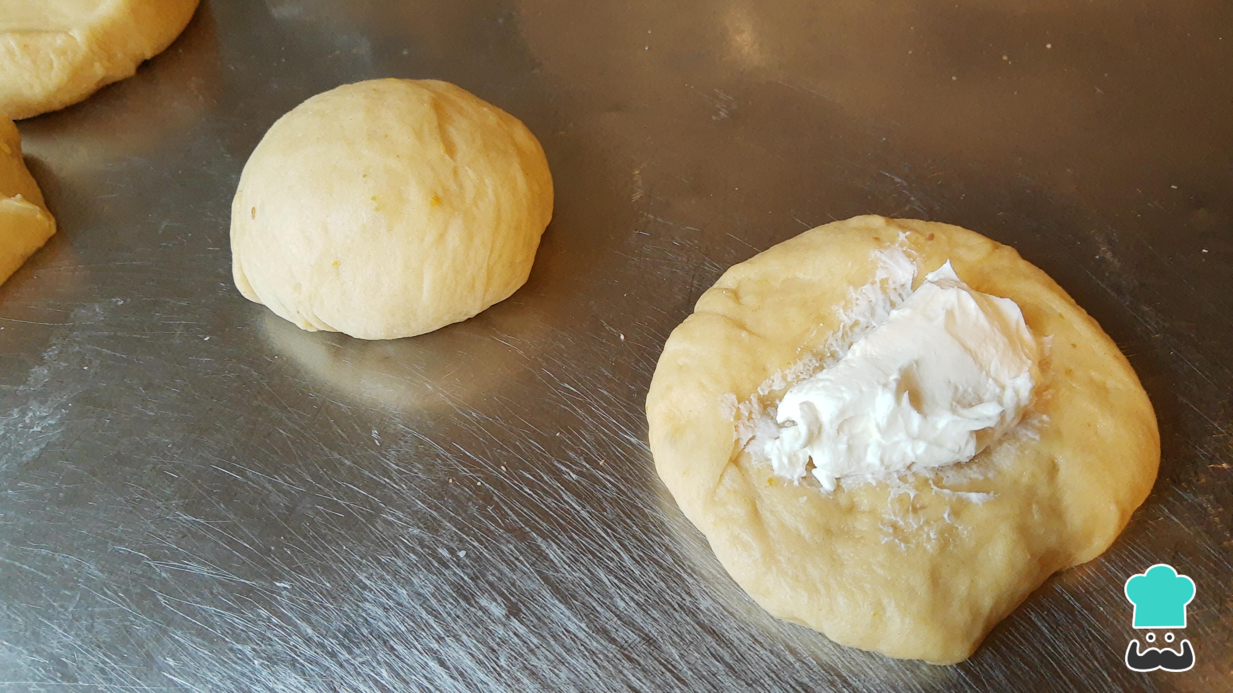 Cuando la masa haya doblado en tamaño, pásala a una superficie plana, pónchala y divide en porciones iguales. Sin embargo, recuerda dejar una porción extra para hacer los huesitos del pan. Luego, extiende ligeramente cada porción de masa para rellenar con una cucharada de queso Philadelphia, puedes formar bolitas de queso antes para facilitar el relleno y, luego, envolver el queso y terminar de bolear cada porción.