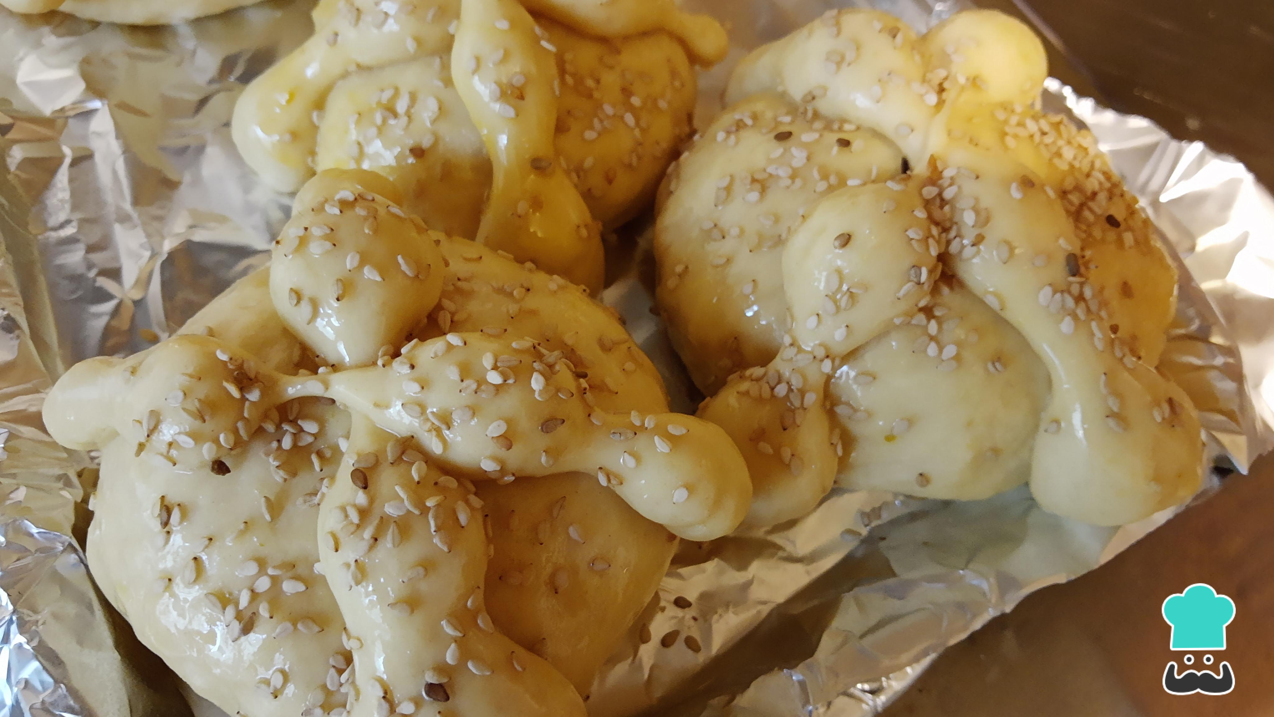 Para los huesitos, toma una porción pequeña de masa, forma una especie de cilindro y con tres dedos presiona y desliza hacia delante y hacia atrás. A continuación, acomoda los huesitos en forma de cruz y, luego, deja reposar los panes en un espacio cálido para que se esponjen y doblen en tamaño. Cuando los panes hayan doblado en tamaño y se vean más esponjosos, barniza con huevo batido y espolvorea ajonjolí. Finalmente, será el momento ideal de llevar al horno a 190 °C durante unos 15-20 minutos.