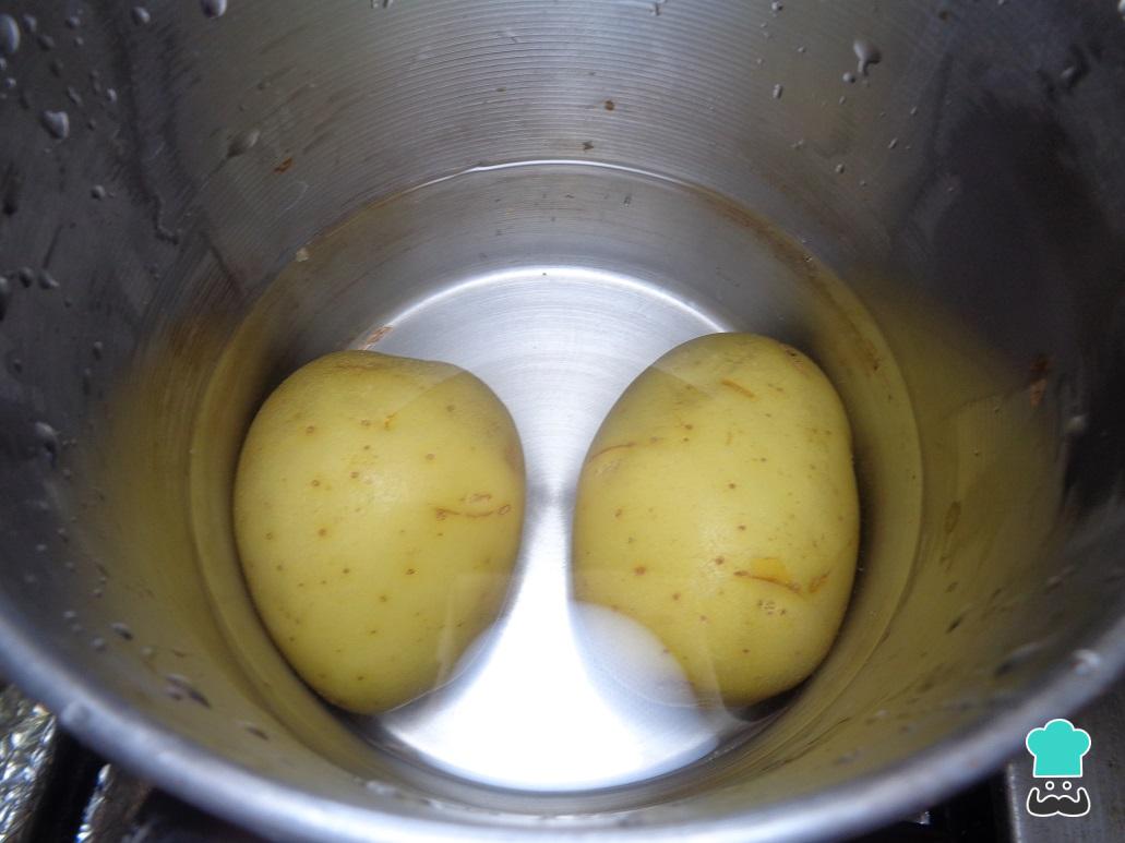 Vamos a comenzar poniendo a cocinar nuestras patatas:para esto las colocamos a hervir en una cacerola con suficiente agua y dejamos que se cuezan hasta que estén muy suaves. Una vez listas las papas, las hacemos puré y las reservamos un momento.