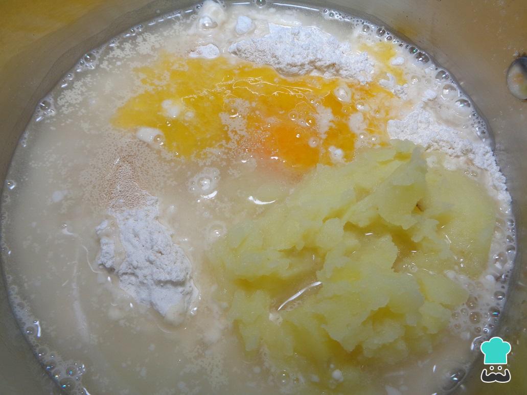 Ahora en un tazón profundo colocamos la harina sin gluten, el puré de patata, la levadura sin gluten, el huevo y el agua tibia, mezclamos perfectamente hasta obtener una masa homogénea.