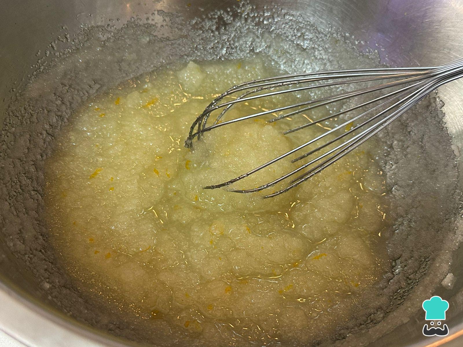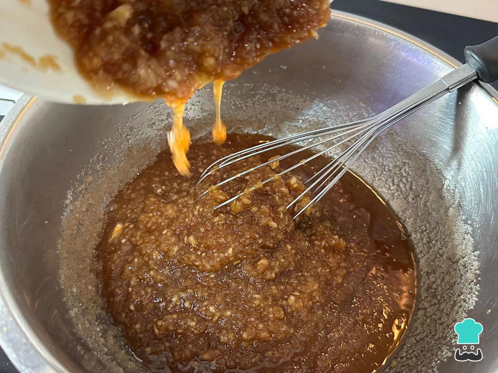 Incorpora a la mezcla el puré de manzana junto con la chancaca que preparaste previamente, y mezcla bien hasta integrar por completo.
