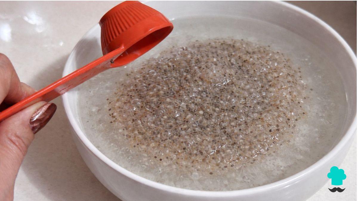 En un bol agrega el agua y mezcla el psyllium rápidamente, porque se gelifica al instante. Deja reposar entre 20 y 30 minutos hasta que se espese.