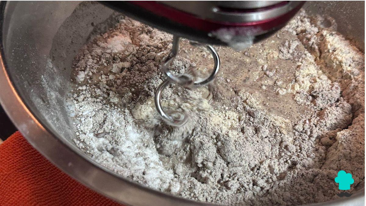 Añade el gel de psyllium a los ingredientes secos y mezcla con una batidora con gancho.