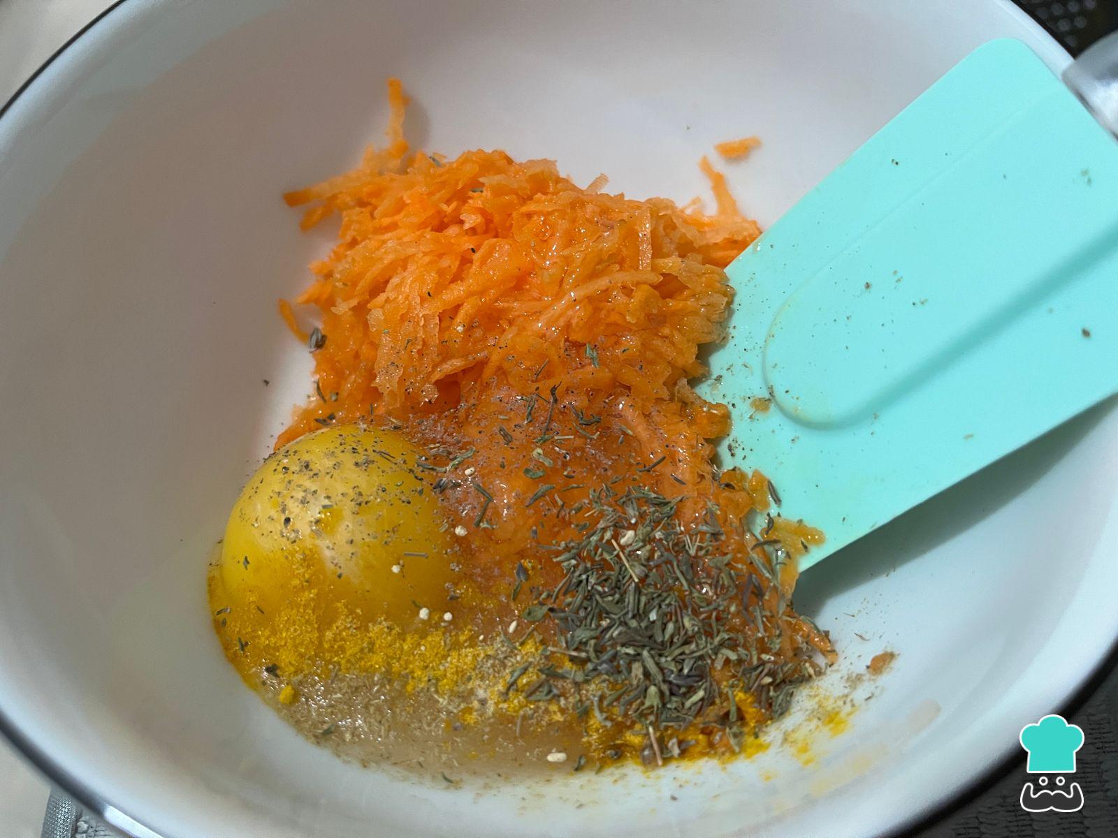 En un recipiente mezcla la zanahoria con el huevo y condimentos al gusto. En este caso, utilizamos cúrcuma, orégano y ajo en polvo, pero puedes agregar tomillo, mostaza, ají molido, entre otros.