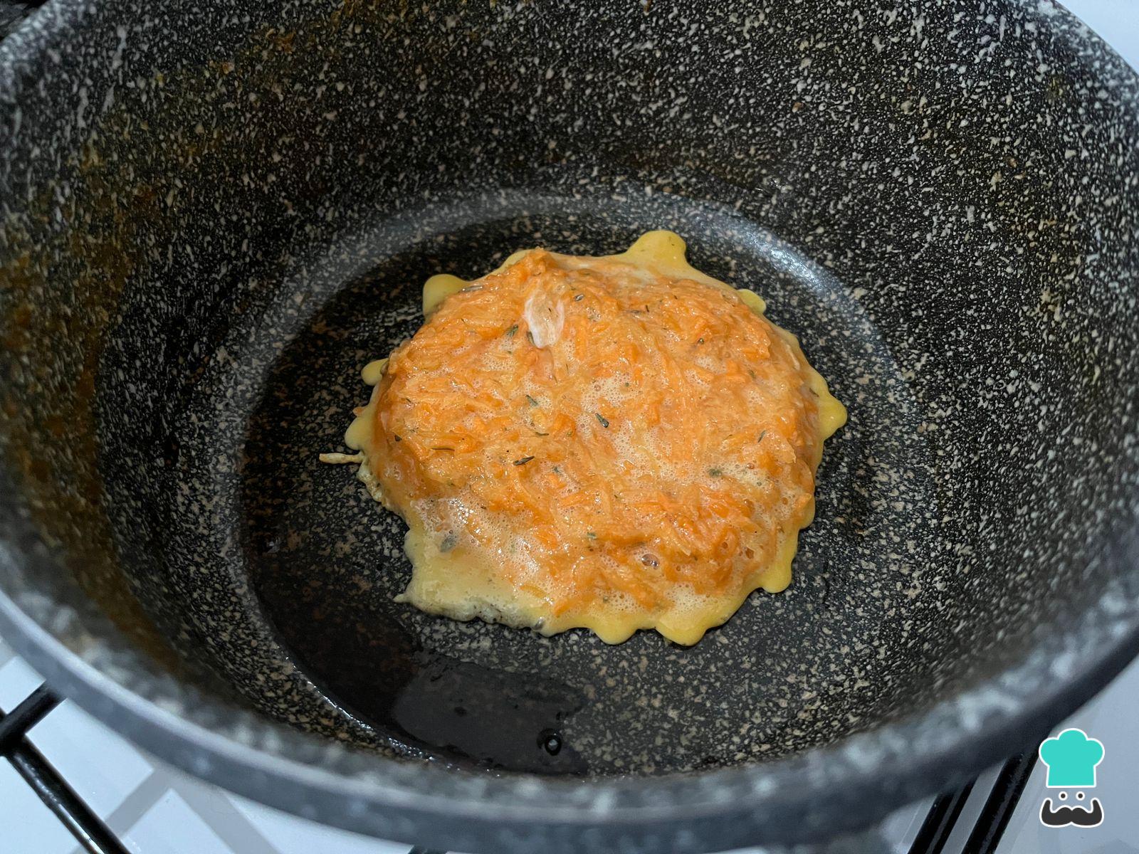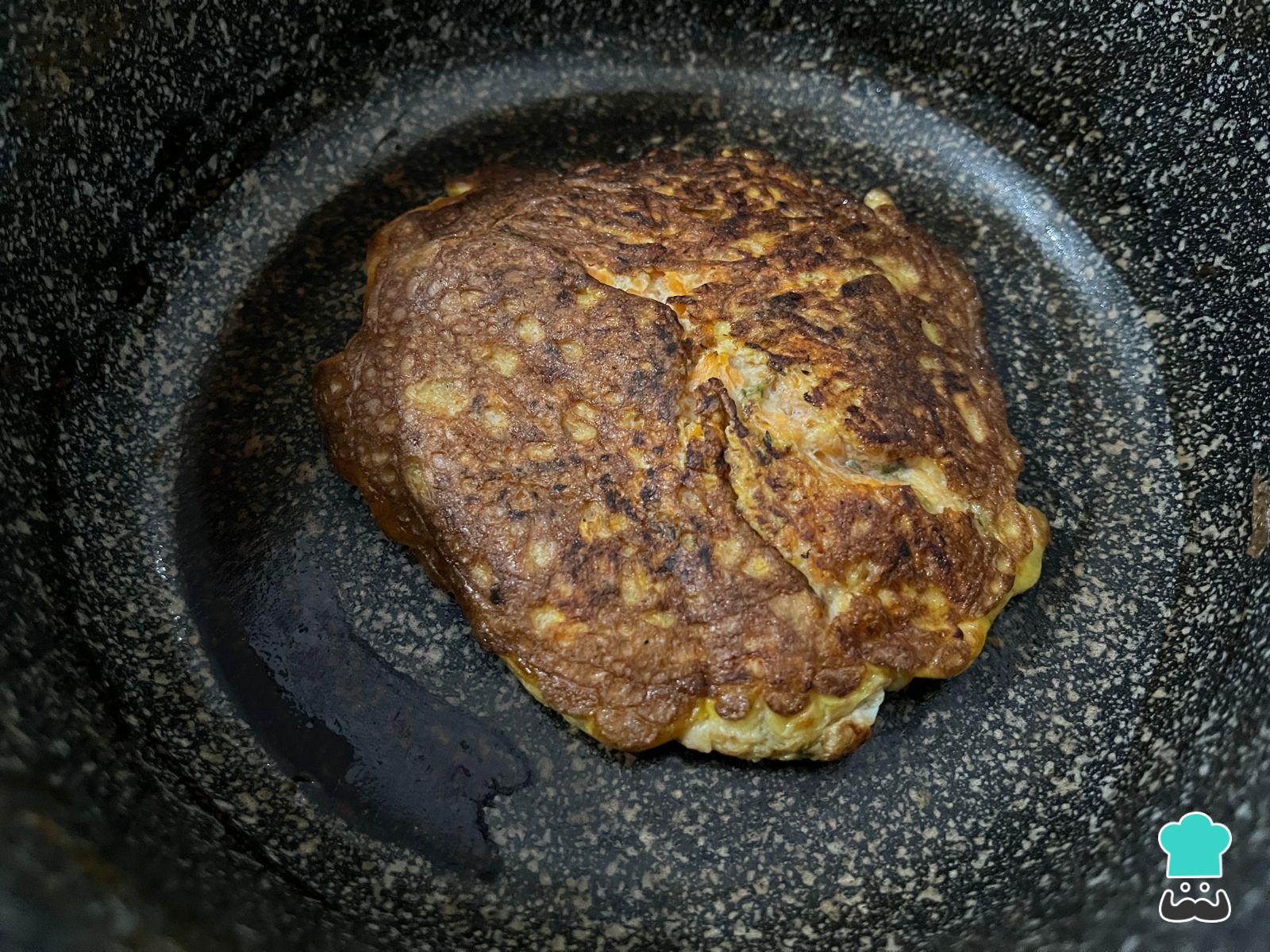 En una sartén a fuego máximo, agrega una cucharadita de aceite. Cuando tome temperatura, agrega la preparación de tu pan de zanahoria sin harina y, cuando se forme una capa en la base que sostenga el líquido del huevo, baja el fuego al medio y tápalo para que se cocine por unos 5 minutos.