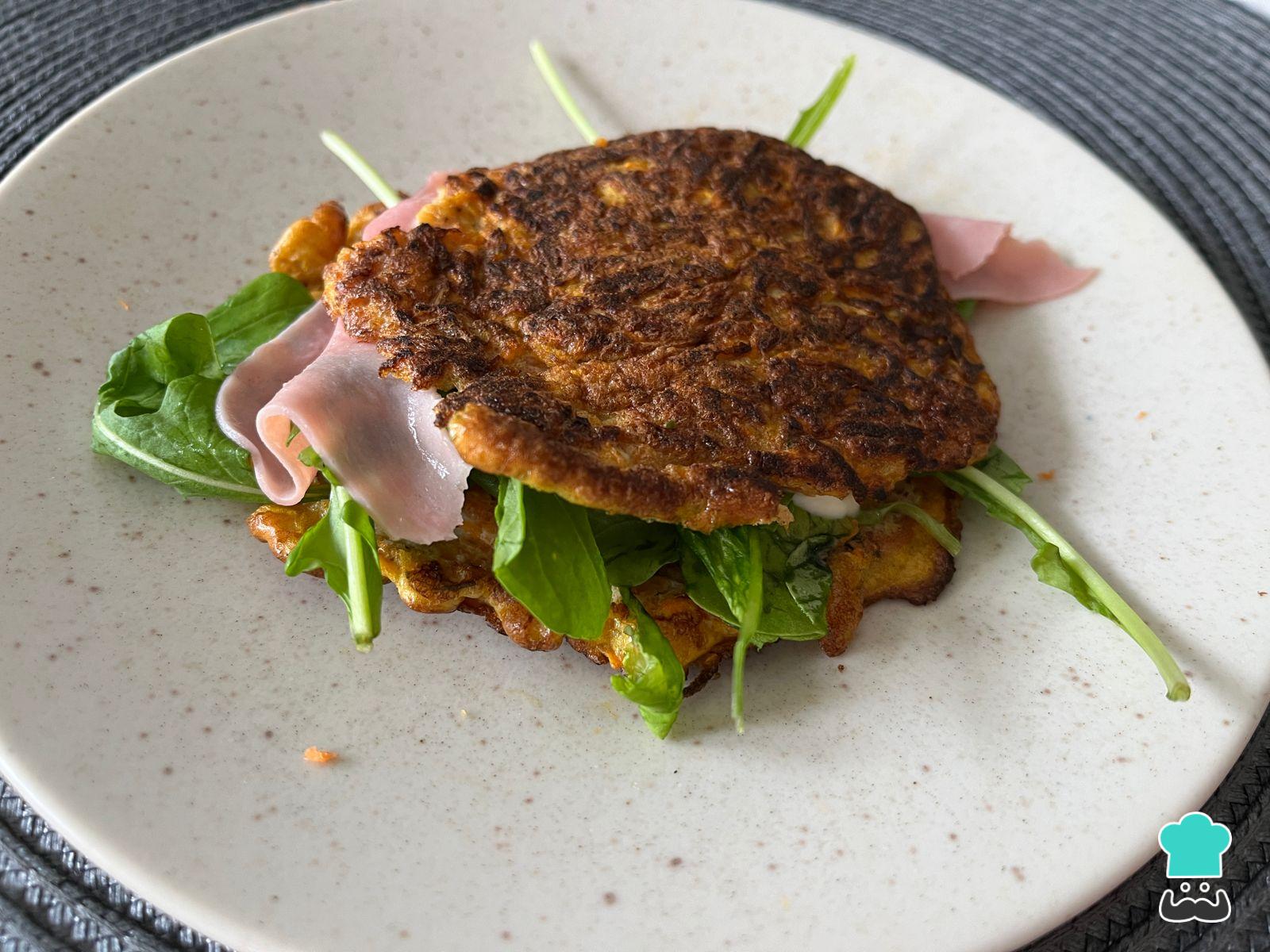Retíralo de la sartén y reserva hasta que se enfríe para cortarlo por la mitad. Ahora rellénalo a tu gusto con tus ingredientes preferidos. En este caso, hemos elegido queso cremoso, jamón natural y rúcula.