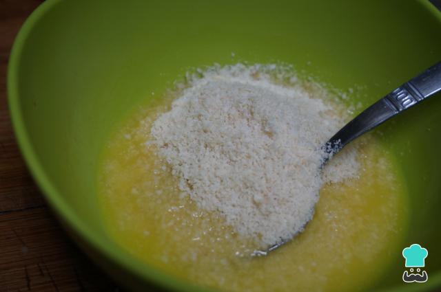 Pon a derretir la mantequilla unos segundos en el microondas. Cuando esté derretida, incorpórala en un bol con las 3 cucharadas de harina de almendra y la harina de coco, mezcla muy bien.