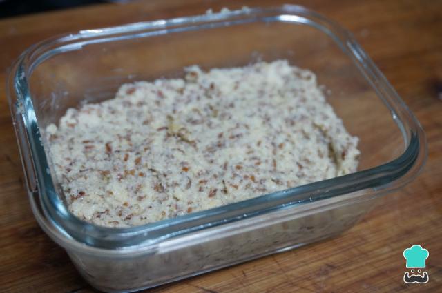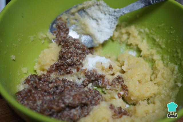 Termina añadiendo las semillas de lino remojadas, vuelve a mezclar todo. Si lo deseas, puedes añadir esta mezcla en una batidora o robot, quedará aún más fina la masa.