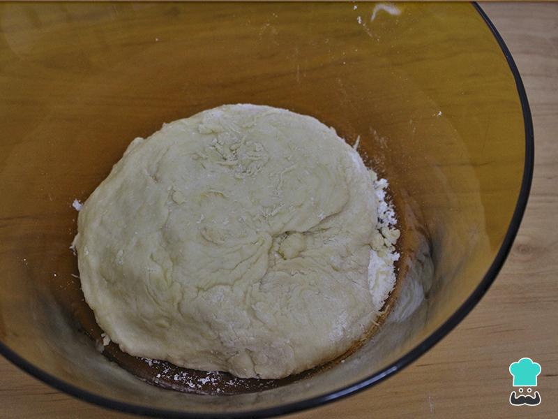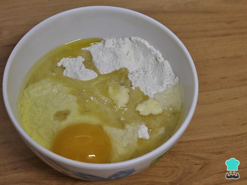 En un bol, deshacemos la mantequilla y la mezclamos con la harina de fuerza. También agregamos el huevo y la disolución del agua anterior. Cabe destacar que en algunos países la harina de fuerza es conocida como harina 0.