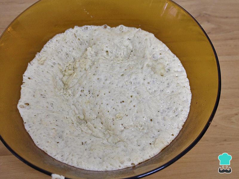 Integramos todo hasta conseguir una masa levemente pegajosa. En ese momento, la vertemos sobre la mesa ligeramente enharinada, nada, un pelín, y amasamos ayudándonos con los dedos, desde el extremos hacia el centro para meterle aire. Hacemos esto en intervalos de cinco minutos de amasado y uno de descanso de la masa.