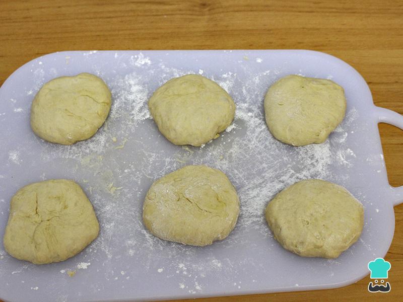 Volvemos a amasar durante cinco minutos la masa fermentada, de nuevo de los extremos hacia el centro. Dividimos la masa en seis porciones, boleamos cada una de ellas y las aplastamos para empezar a formar los panes caseros. Dejamos otros 15 minutos tapadas.
