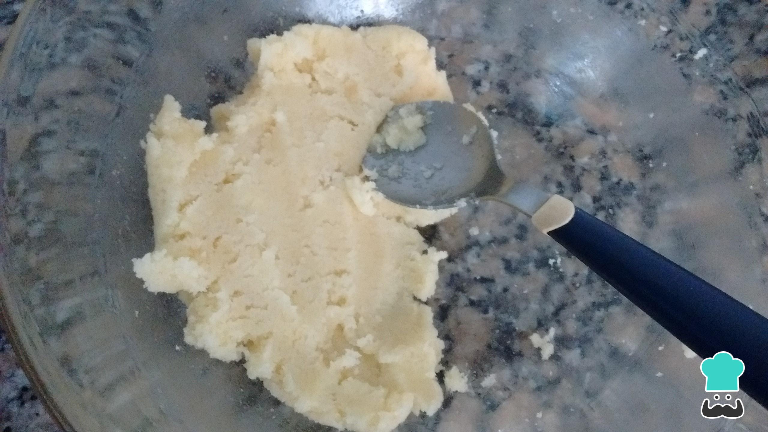 Por otro lado, crema la manteca con el azúcar y los condimentos. Para ello, deberás disponer de la manteca blanda, a temperatura ambiente, en un recipiente junto con el azúcar, la esencia de vainilla y el agua de azahar. Mezcla con una cuchara o espátula hasta que quede una crema homogénea.