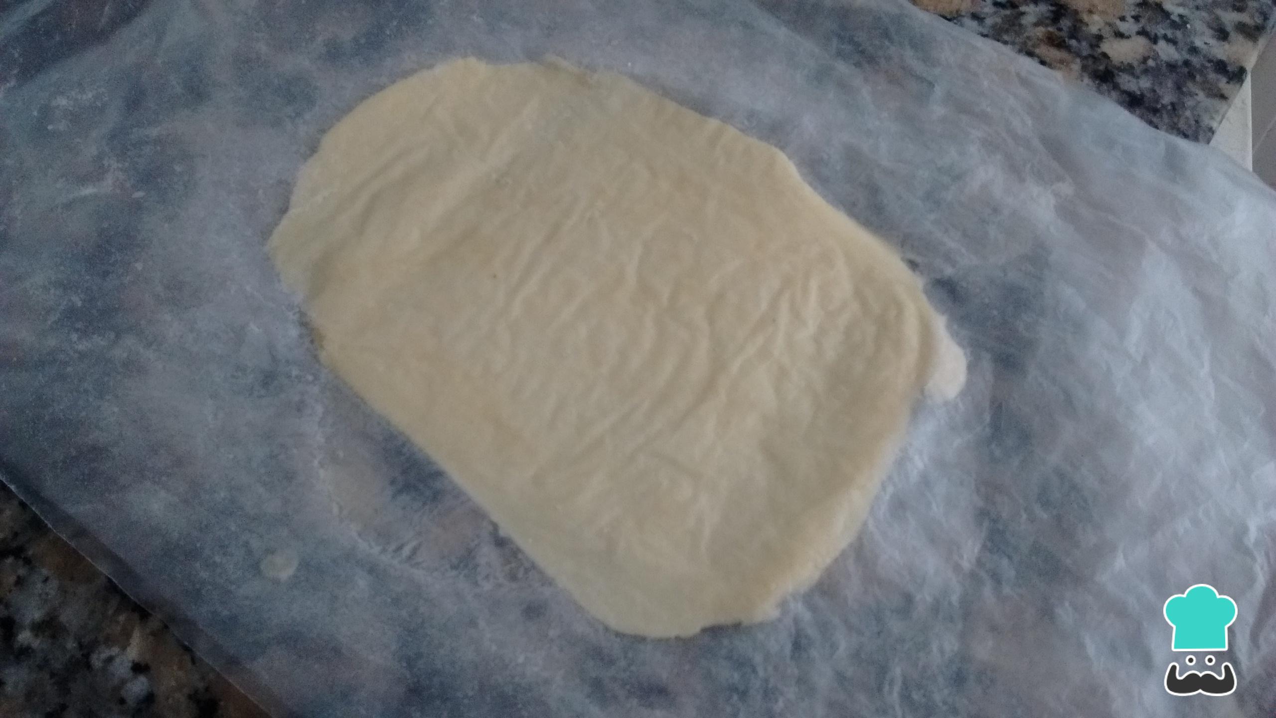 Pasado el tiempo, retira la masa de la heladera, estírala y dóblala por la mitad nuevamente y refrigerándola otros 30 minutos. Repite una vez mas y, luego, estira la masa de forma rectangular. Siempre sé muy cuidadoso con la masa ya que es frágil y, si se rompe, se saldrá el empaste y te resultará difícil continuar maniobrando.