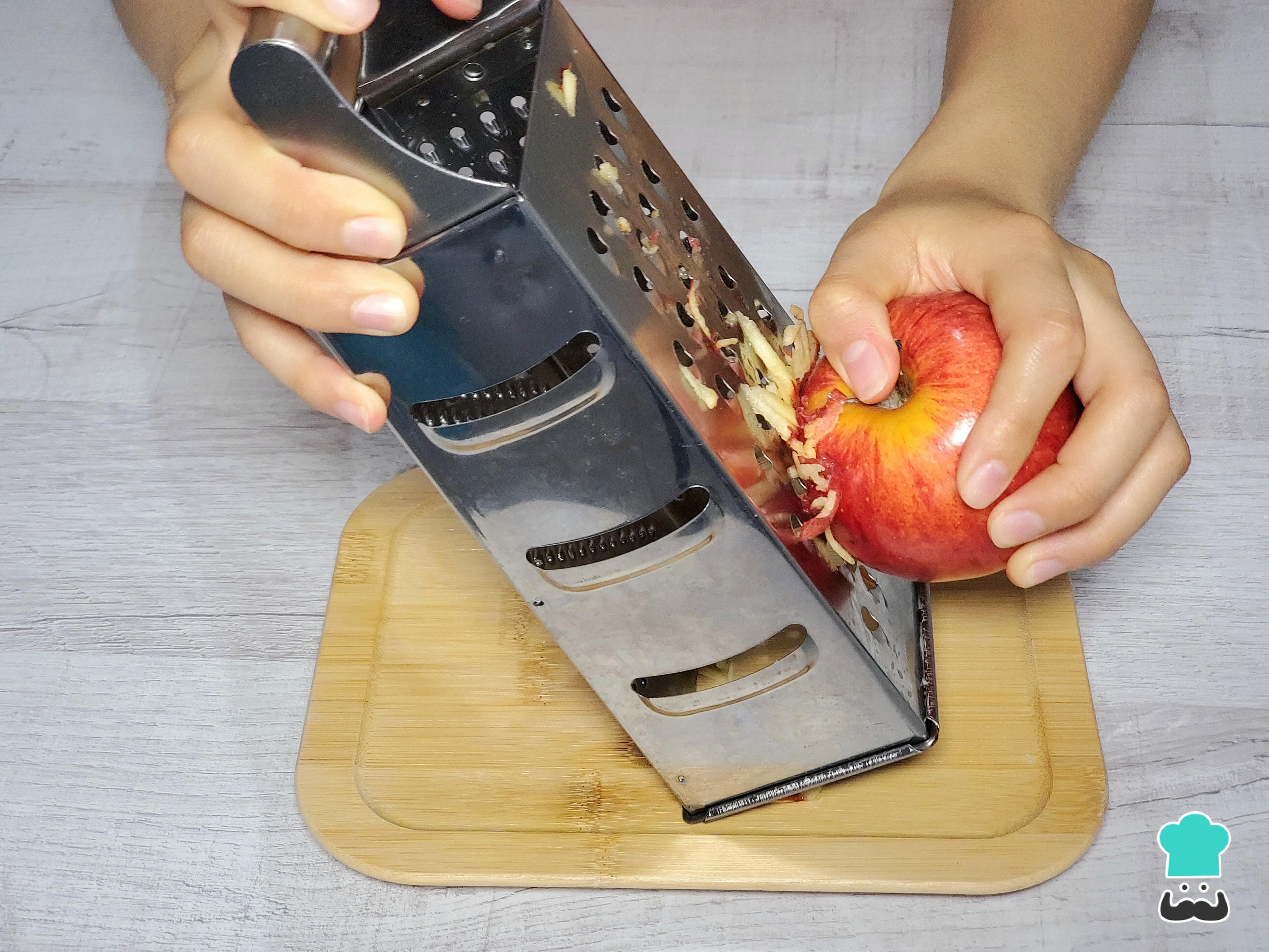 Mientras tanto, lava y ralla la mitad de la manzana, corta la otra mitad en rodajas delgadas.