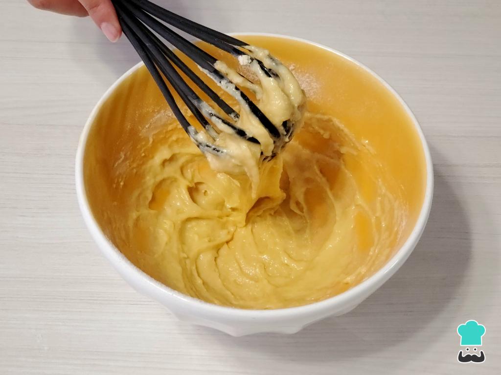 Incorpora los ingredientes secos tamizados, que son la harina y el polvo de hornear, y sigue batiendo hasta que se disuelvan todos los grumos.