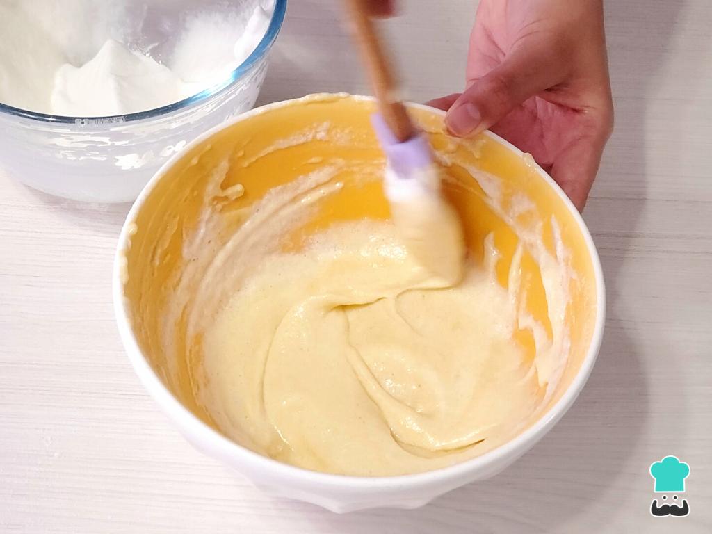 Para concluir con la masa, integra las claras a punto de nieve en tres tiempos, es decir, vierte un tercio de las claras y combina ambas mezclas con ayuda de un batidor de globo; luego agrega el segundo tercio, pero esta vez cambia de accesorio a una espátula de goma y mezcla de forma envolvente. Termina añadiendo el último tercio del merengue y sigue mezclando de la misma forma.
