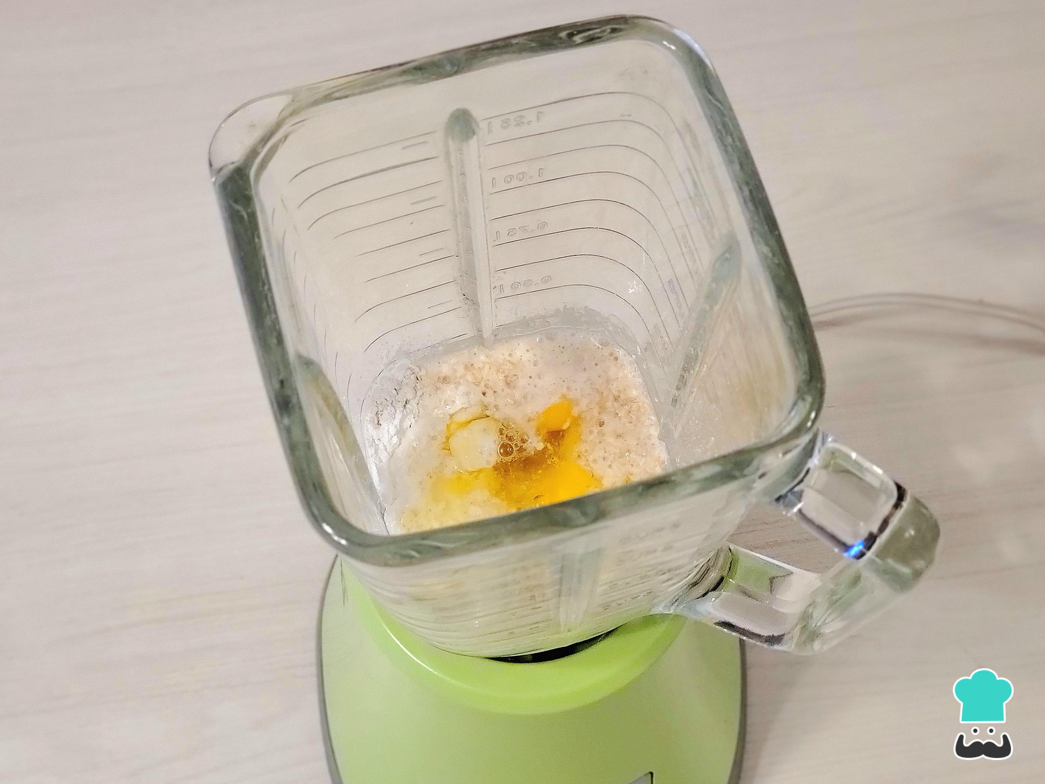Empieza colocando en la licuadora la avena en hojuelas, los huevos y los plátanos pelados. No hace falta utilizar avena en polvo, ya que se tritura junto al resto de los ingredientes.