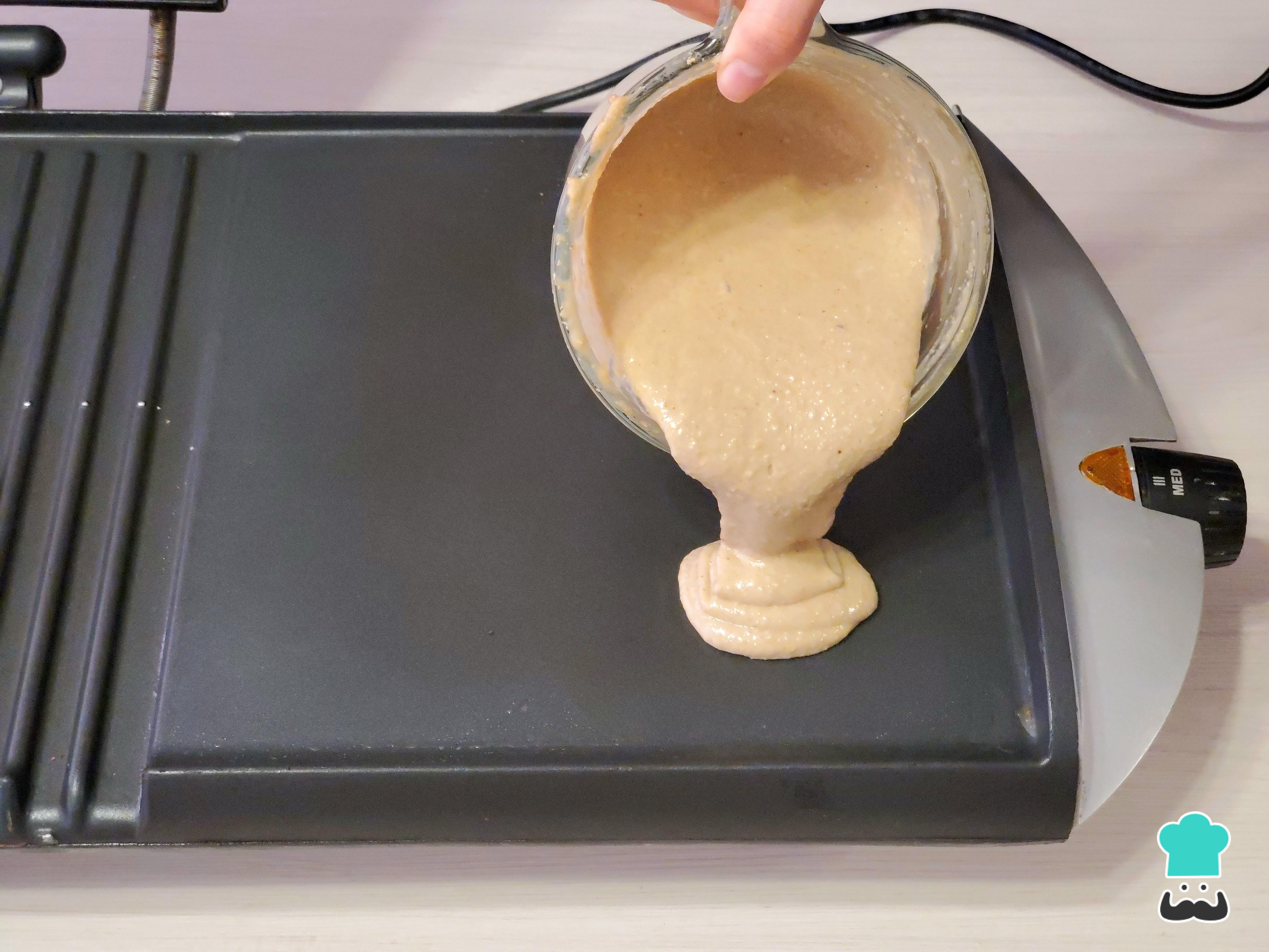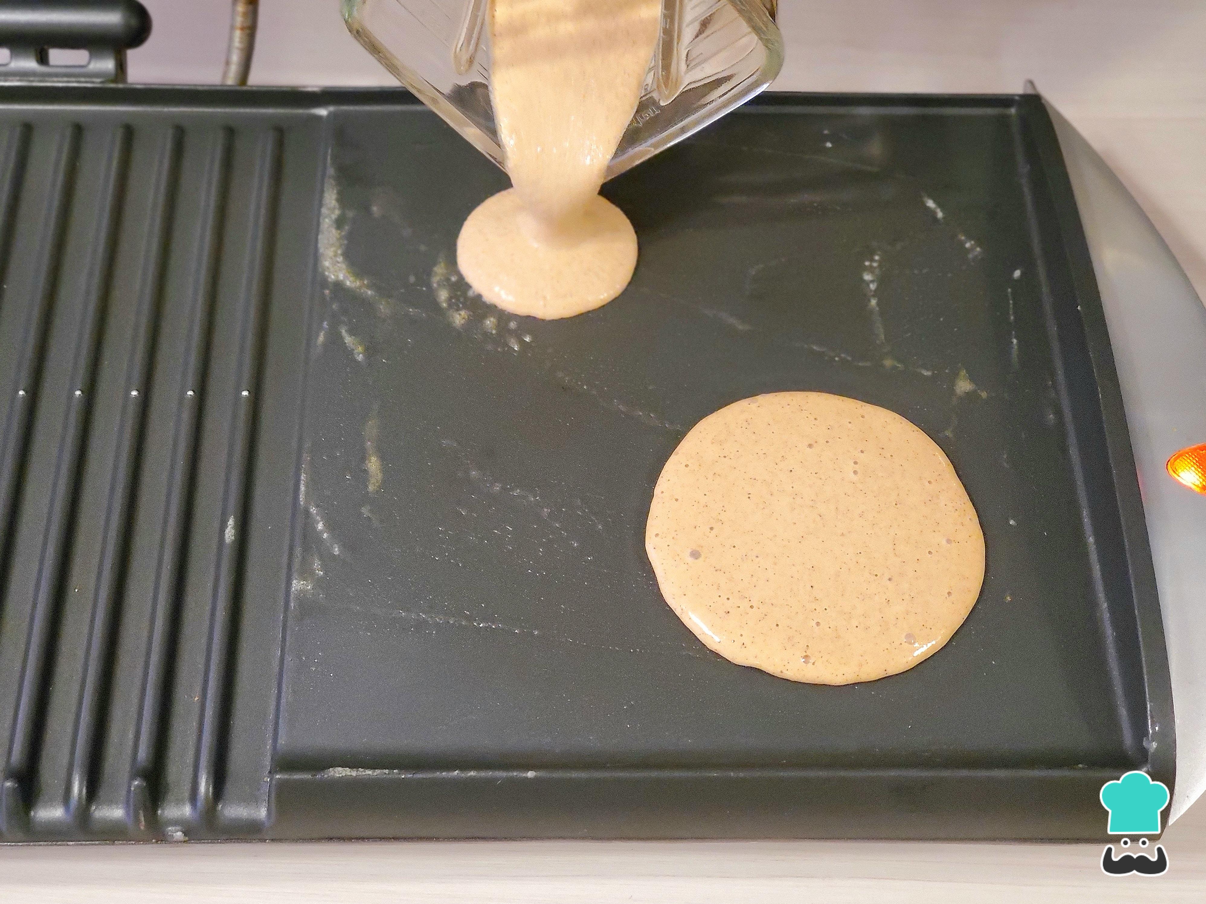 Calienta una sartén antiadherente o una plancha a fuego medio y úntala con un poco de mantequilla distribuyéndola bien. Luego, vierte un cucharón de masa y da movimientos circulares para proporcionar forma a los panqueques con avena.