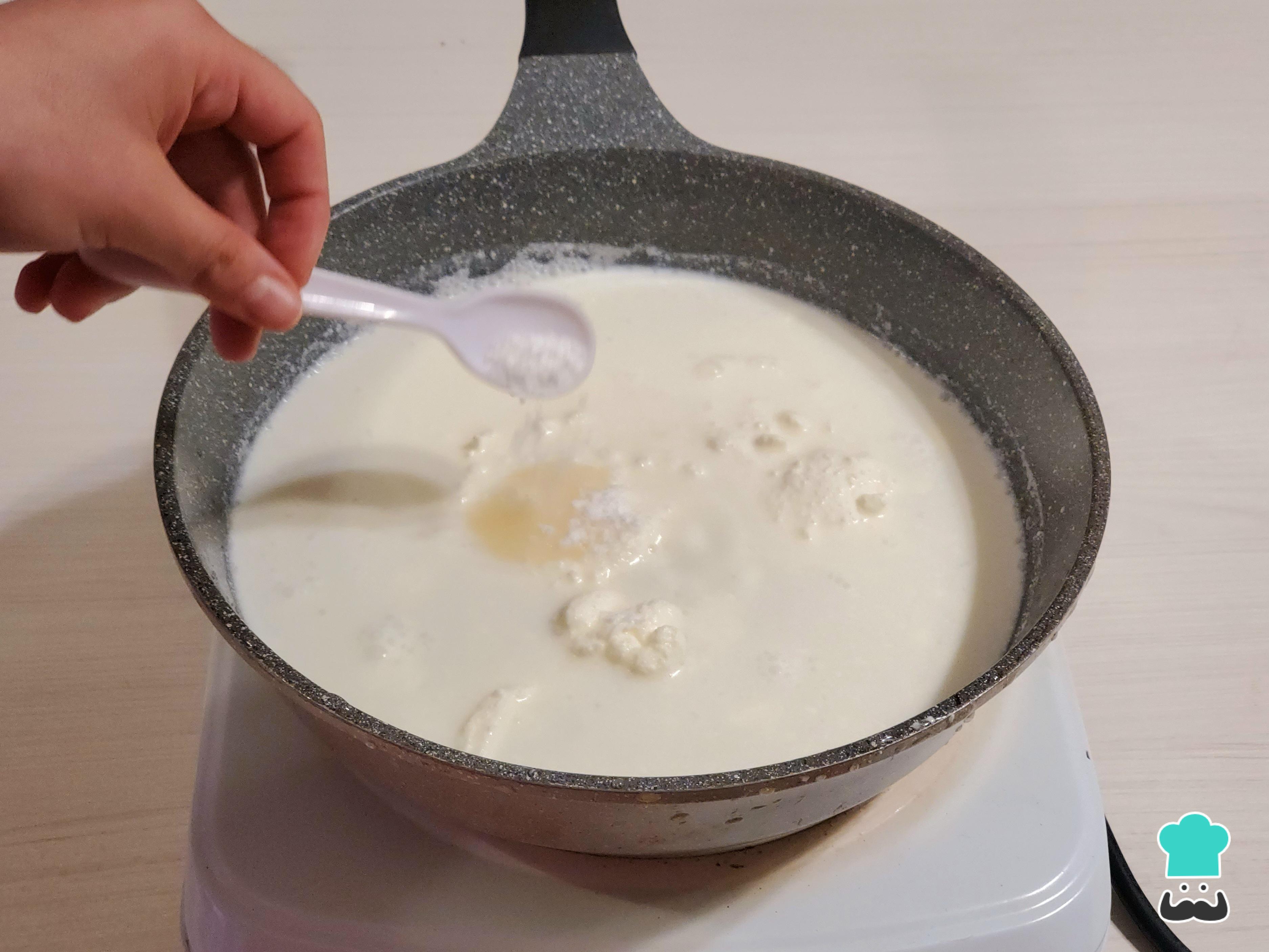 En una olla profunda vierte la crema de leche junto con la leche. A continuación, añade sal (debe quedar ligeramente subida de sal, ya que la papa la absorberá) y una pizca de pimienta blanca. Deja que la mezcla rompa hervor.