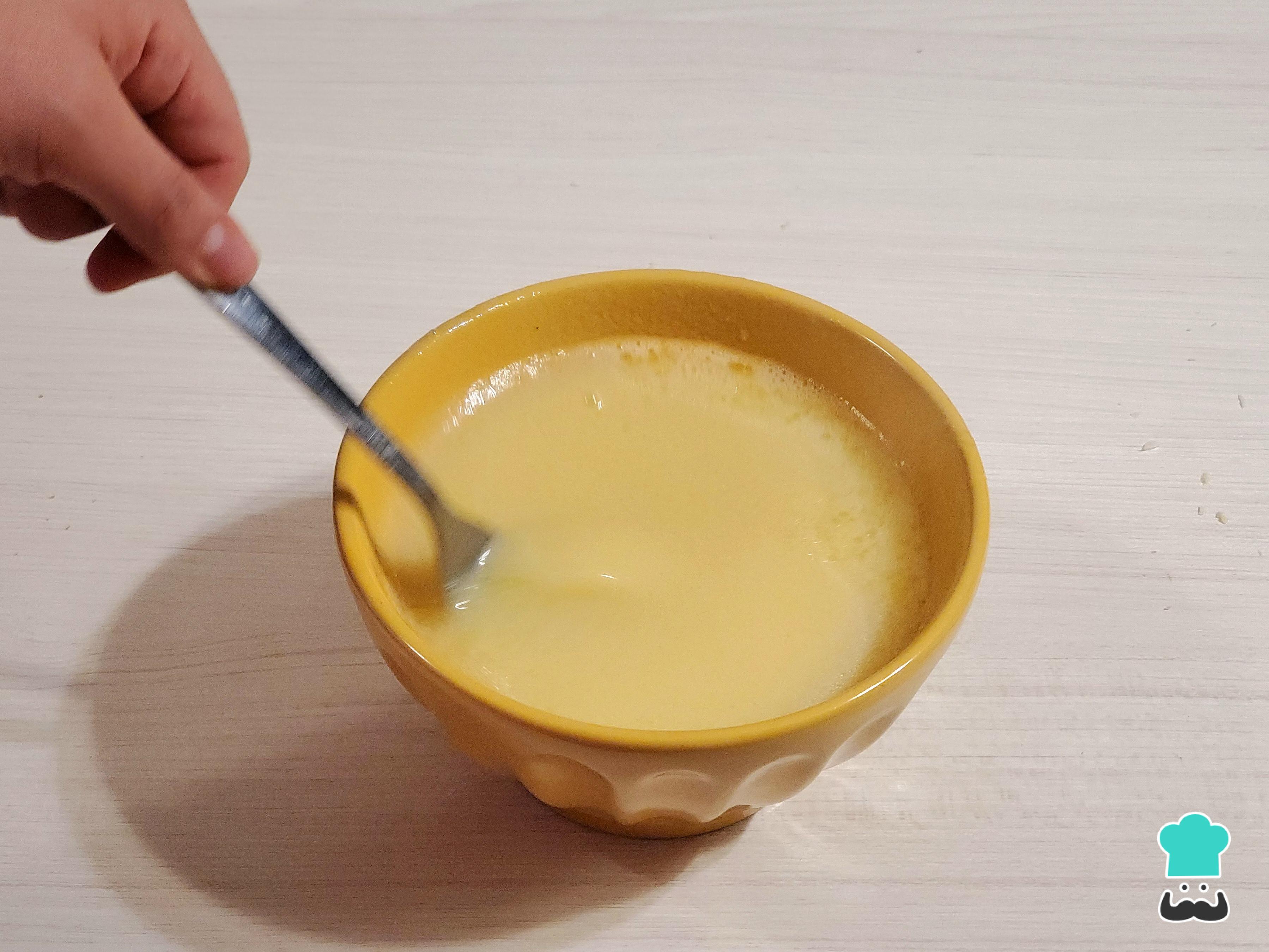 Aparte, sin desechar la mezcla de crema de leche tibia, viértela lentamente en el tazón de los huevos batidos. Hazlo poco a poco y removiendo constantemente con un batidor de globo o un tenedor para evitar que la crema caliente coagule los huevos.