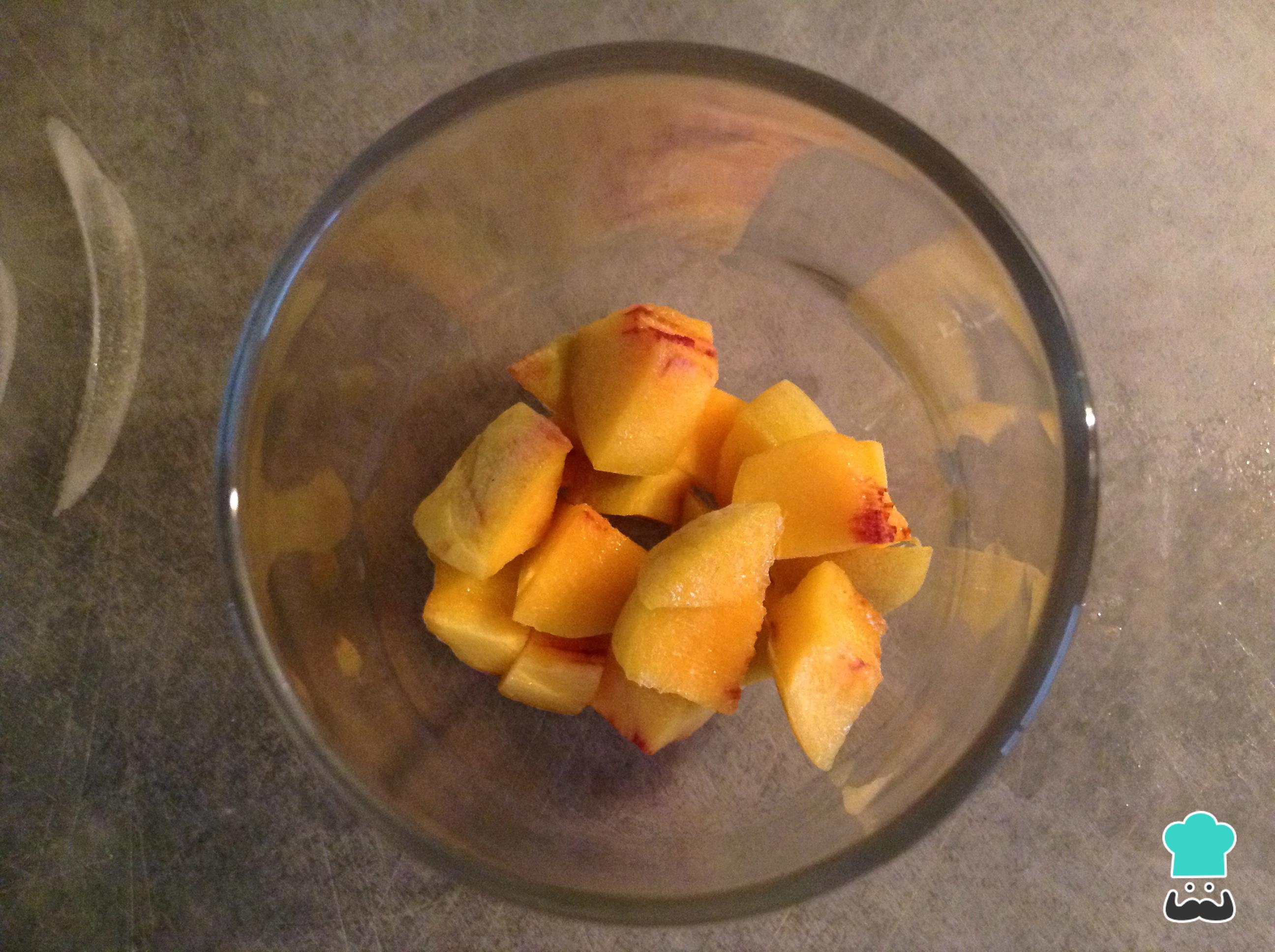 Lo ideal es lavar toda nuestras frutas, la primera fruta que vamos a utilizar es el durazno, lo picamos en cuadros medianos como se observa en la foto y adicionarla en el fondo del vaso de vidrio.