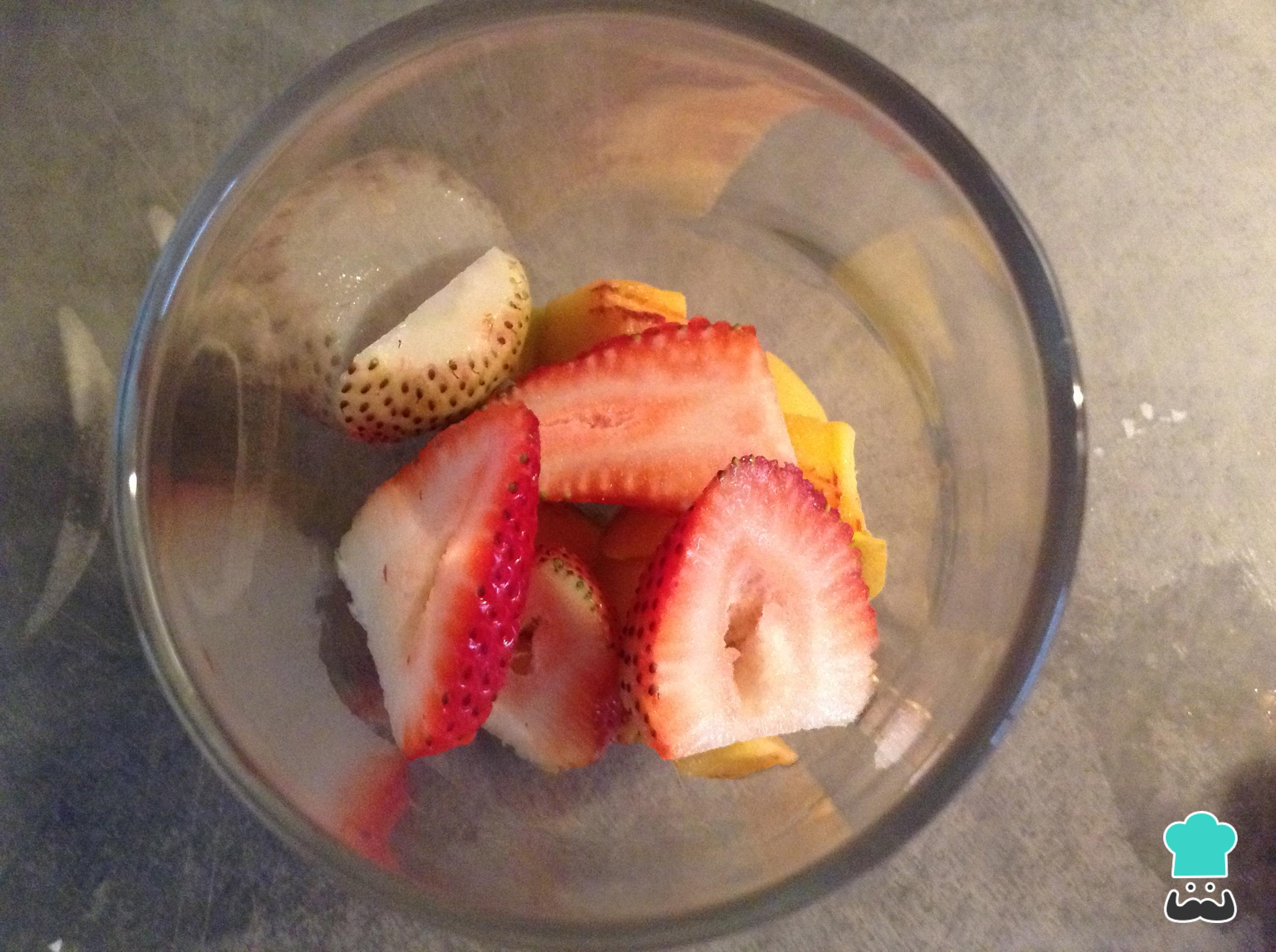 Lavar nuestras fresas y retirar el tallo, picar en laminas y adicionar en el vaso de vidrio.