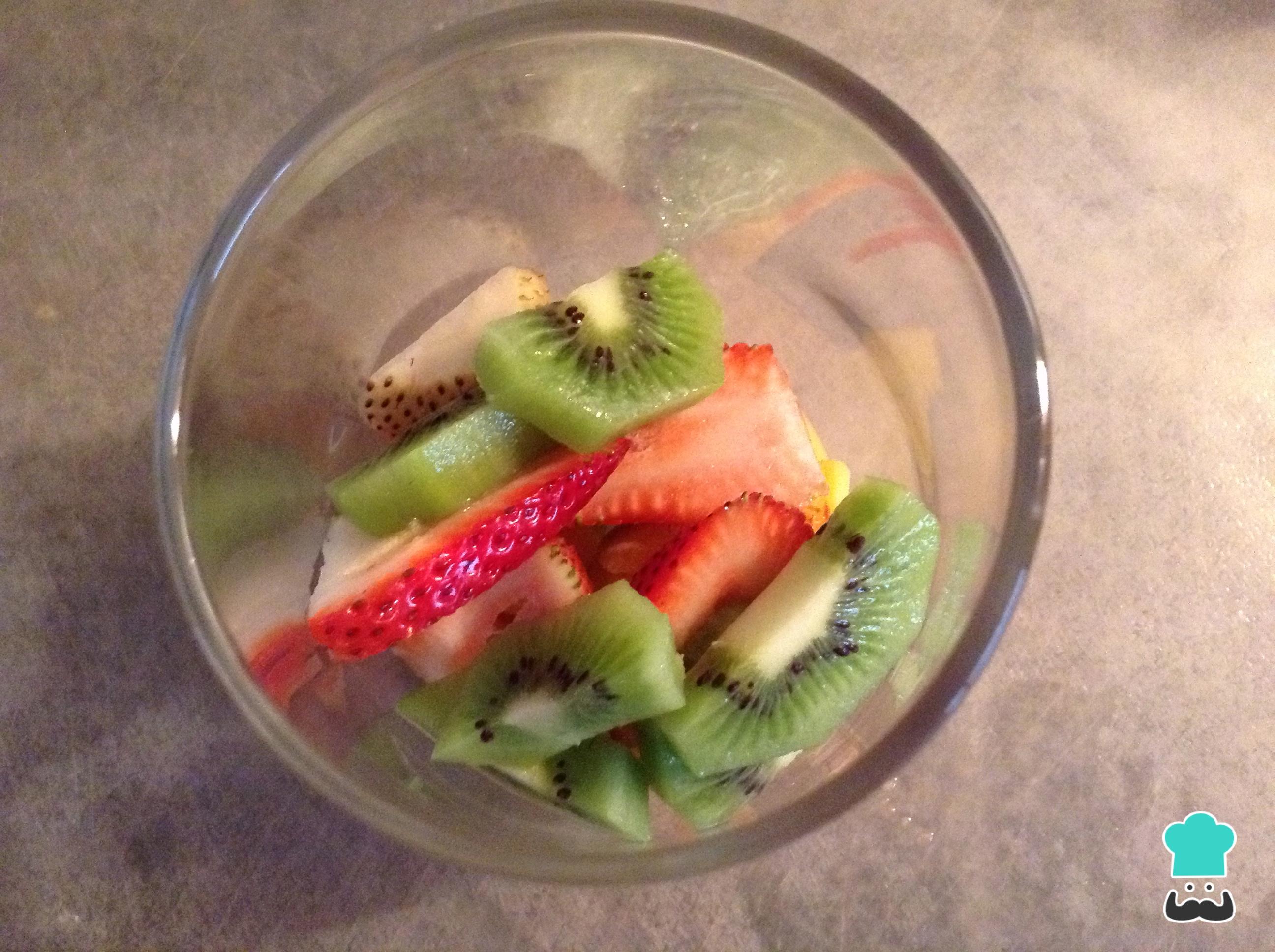 Pelar nuestro kiwi y cortarlo en tajadas, para adicionarlo en los vasos cortar en la mitad las rodajas y mezclar con los pasos anteriores.