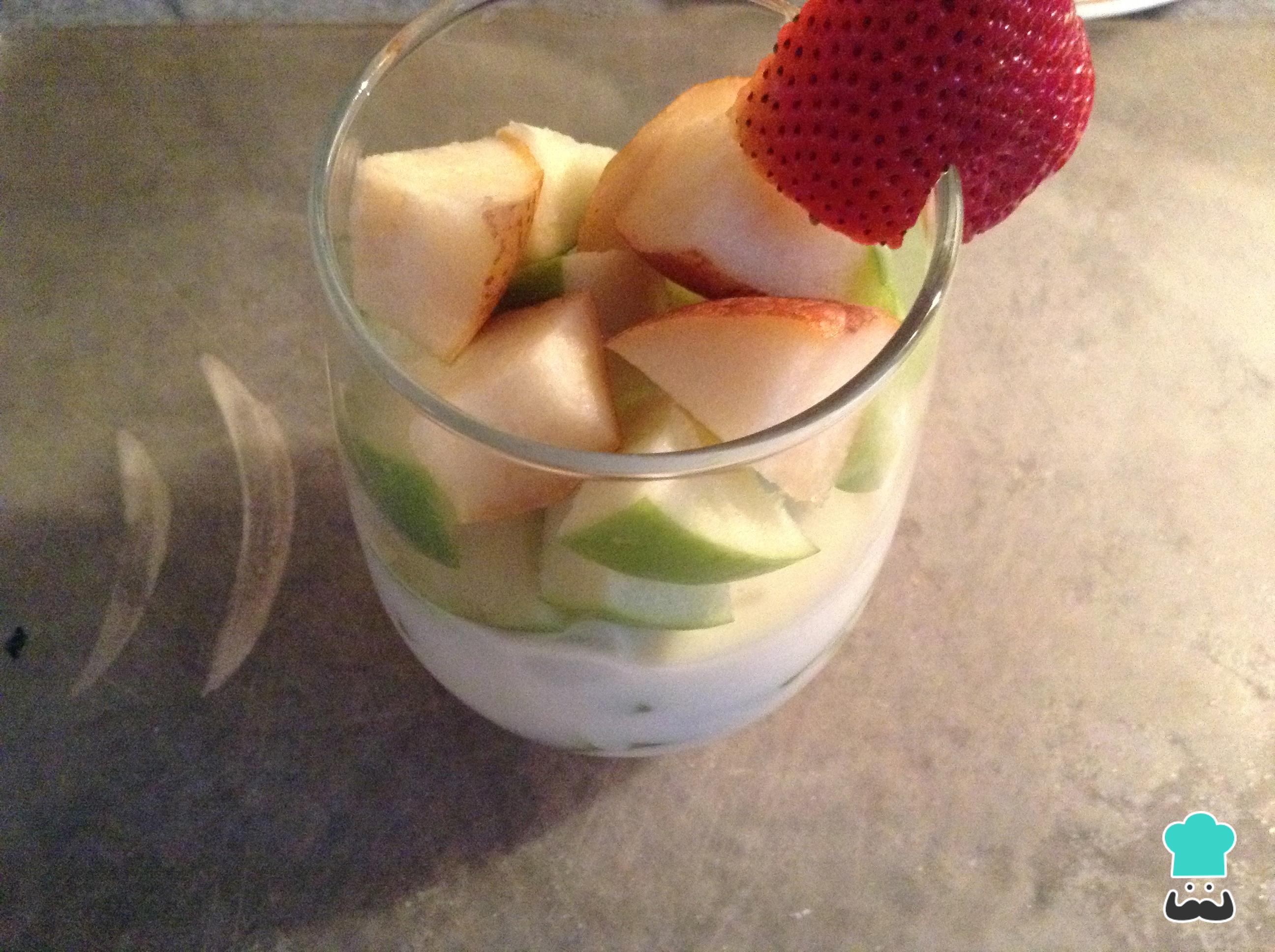 Bañar las frutas que tenemos en el vaso con el yoghurt.